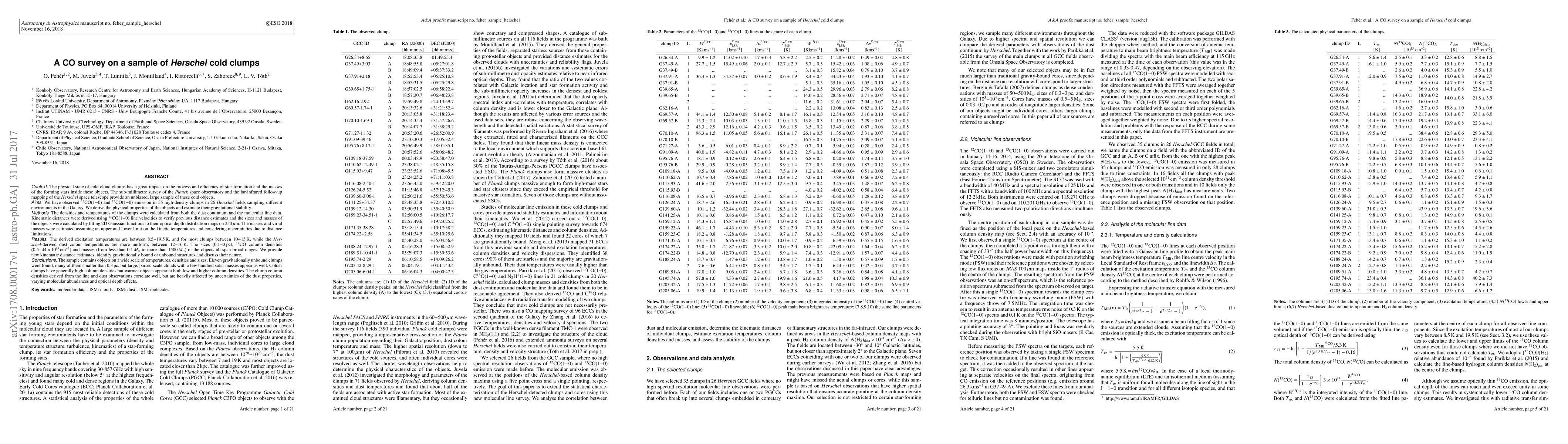 The physical state of cold cloud clumps has a great impact on the process and efficiency of star formation and the masses of the forming stars inside these objects. The sub-millimetre survey of the Planck space observatory and the far-infrared follow-up mapping of the Herschel space telescope provide an unbiased, large sample of these cold objects. We have observed $^{12}$CO(1$-$0) and $^{13}$CO(1$-$0) emission in 35 clumps in 26 Herschel fields sampling different environments in the Galaxy. Densities and temperatures were calculated from both the dust continuum and the molecular line data, kinematic distances were derived using $^{13}$CO line velocities and clump sizes and masses were calculated by fitting 2D Gaussian functions to the optical depth distribution maps. Clump masses and virial masses were estimated assuming an upper and lower limit on the kinetic temperatures and considering uncertainties due to distance limitations. The excitation temperatures are between 8.5$-$19.5 K, while the Herschel-derived dust colour temperatures are 12$-$16 K. The sizes (0.1$-$3 pc), $^{13}$CO column densities (0.5$-$44$\times$10$^{15}$ cm$^{-2}$) and masses (from less than 0.1 $M_{\odot}$ to more than 1500 $M_{\odot}$) of the objects span broad ranges. Eleven gravitationally unbound clumps were found, many of them smaller than 0.3 pc, but large, parsec-scale clouds with a few hundred solar masses appear as well. Colder clumps have generally high column densities but warmer objects appear at both low and higher column densities. The clump column densities derived from the line and dust observations correlate well, but are heavily affected by uncertainties of the dust properties, varying molecular abundances and optical depth effects.