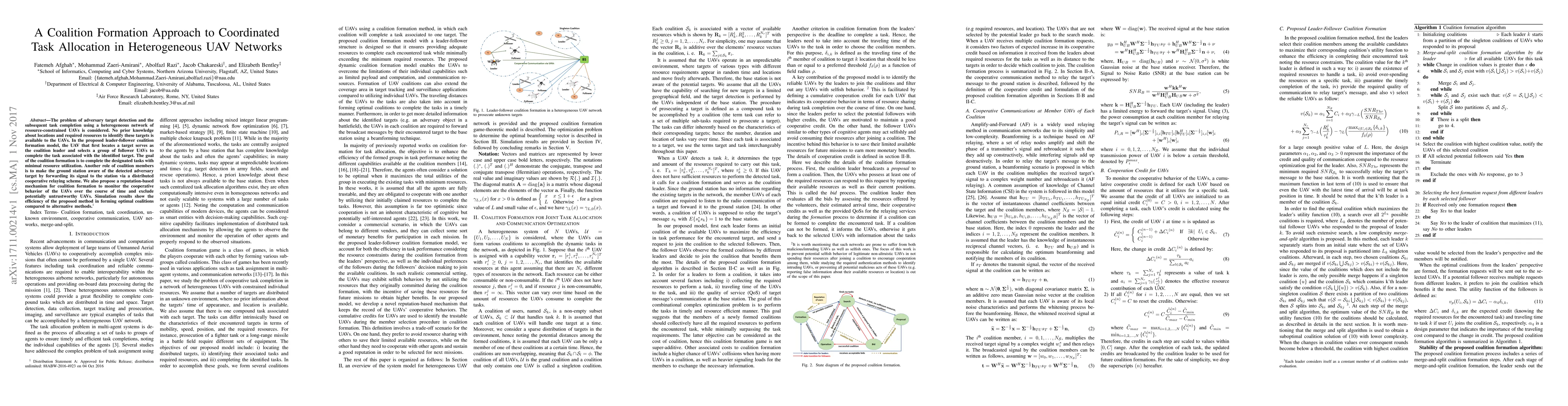 The problem of adversary target detection and the subsequent task completion using a heterogeneous network of resource-constrained UAVs is considered. No prior knowledge about locations and required resources to identify these targets is available to the UAVs. In the proposed leader-follower coalition formation model, the UAV that first locates a target serves as the coalition leader and selects a group of follower UAVs to complete the task associated with the identified target. The goal of the coalition formation is to complete the designated tasks with minimal resource utilization. Another role of coalition members is to make the ground station aware of the detected adversary target by forwarding its signal to the station via a distributed cooperative relaying scheme. We also propose a reputation-based mechanism for coalition formation to monitor the cooperative behavior of the UAVs over the course of time and exclude potentially untrustworthy UAVs. Simulation results show the efficiency of the proposed method in forming optimal coalitions compared to alternative methods.