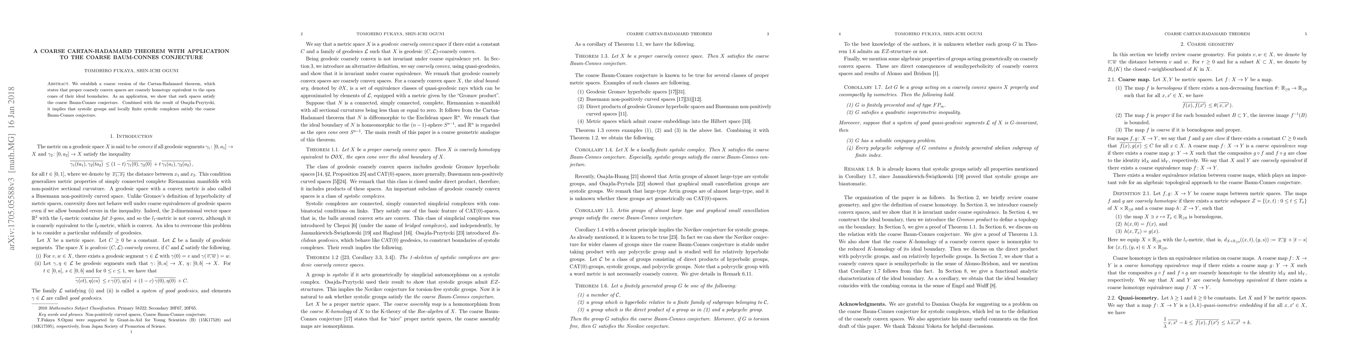 This paper establishes a coarse version of the Cartan-Hadamard theorem, proving that proper coarsely convex spaces are coarsely homotopy equivalent to the open cones of their ideal boundaries. The result is applied to show that these spaces satisfy the coarse Baum-Connes conjecture, extending the implication to systolic groups and locally finite systolic complexes.