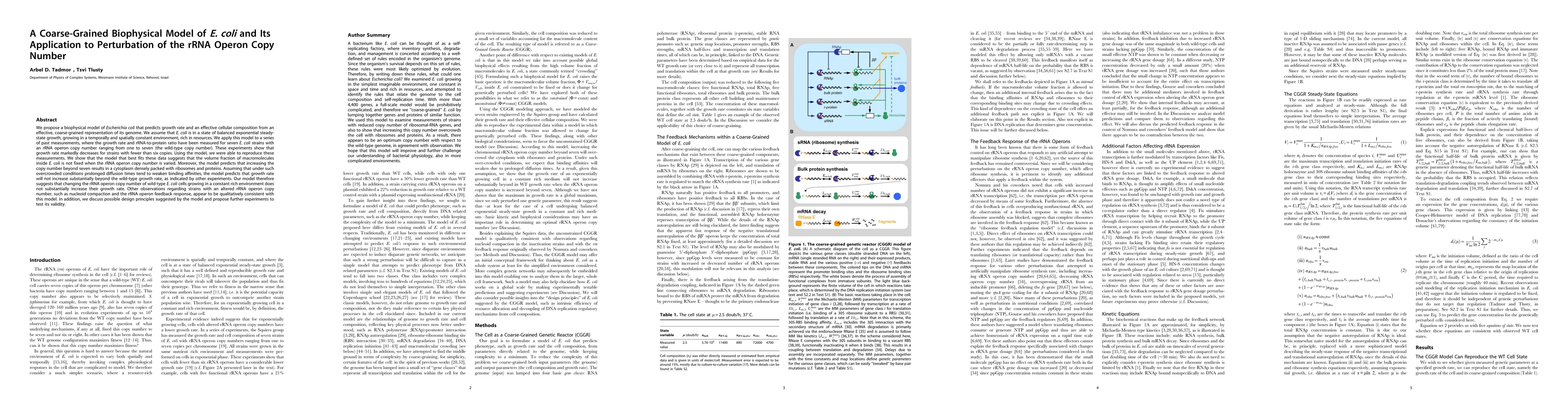 We propose a biophysical model of Escherichia coli that predicts growth rate and an effective cellular composition from an effective, coarse-grained representation of its genome. We assume that E. coli is in a state of balanced exponential steadystate growth, growing in a temporally and spatially constant environment, rich in resources. We apply this model to a series of past measurements, where the growth rate and rRNA-to-protein ratio have been measured for seven E. coli strains with an rRNA operon copy number ranging from one to seven (the wild-type copy number). These experiments show that growth rate markedly decreases for strains with fewer than six copies. Using the model, we were able to reproduce these measurements. We show that the model that best fits these data suggests that the volume fraction of macromolecules inside E. coli is not fixed when the rRNA operon copy number is varied. Moreover, the model predicts that increasing the copy number beyond seven results in a cytoplasm densely packed with ribosomes and proteins. Assuming that under such overcrowded conditions prolonged diffusion times tend to weaken binding affinities, the model predicts that growth rate will not increase substantially beyond the wild-type growth rate, as indicated by other experiments. Our model therefore suggests that changing the rRNA operon copy number of wild-type E. coli cells growing in a constant rich environment does not substantially increase their growth rate. Other observations regarding strains with an altered rRNA operon copy number, such as nucleoid compaction and the rRNA operon feedback response, appear to be qualitatively consistent with this model. In addition, we discuss possible design principles suggested by the model and propose further experiments to test its validity.
