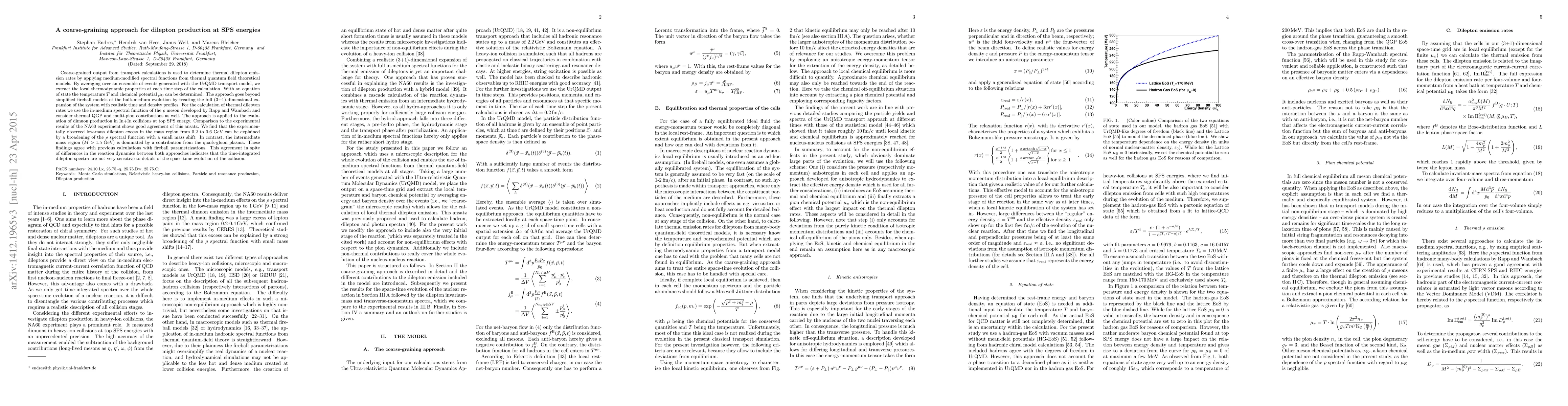 Coarse-grained output from transport calculations is used to determine thermal dilepton emission rates by applying medium-modified spectral functions from thermal quantum field theoretical models. By averaging over an ensemble of events generated with the UrQMD transport model, we extract the local thermodynamic properties at each time step of the calculation. With an equation of state the temperature $T$ and chemical potential $\mu_{\mathrm{B}}$ can be determined. The approach goes beyond simplified fireball models of the bulk-medium evolution by treating the full (3+1)-dimensional expansion of the system with realistic time and density profiles. For the calculation of thermal dilepton rates we use the in-medium spectral function of the $\rho$ meson developed by Rapp and Wambach and consider thermal QGP and multi-pion contributions as well. The approach is applied to the evaluation of dimuon production in In+In collisions at top SPS energy. Comparison to the experimental results of the NA60 experiment shows good agreement of this ansatz. We find that the experimentally observed low-mass dilepton excess in the mass region from 0.2 to 0.6 GeV can be explained by a broadening of the $\rho$ spectral function with a small mass shift. In contrast, the intermediate mass region ($M > 1.5$ GeV) is dominated by a contribution from the quark-gluon plasma. These findings agree with previous calculations with fireball parametrizations. This agreement in spite of differences in the reaction dynamics between both approaches indicates that the time-integrated dilepton spectra are not very sensitive to details of the space-time evolution of the collision.