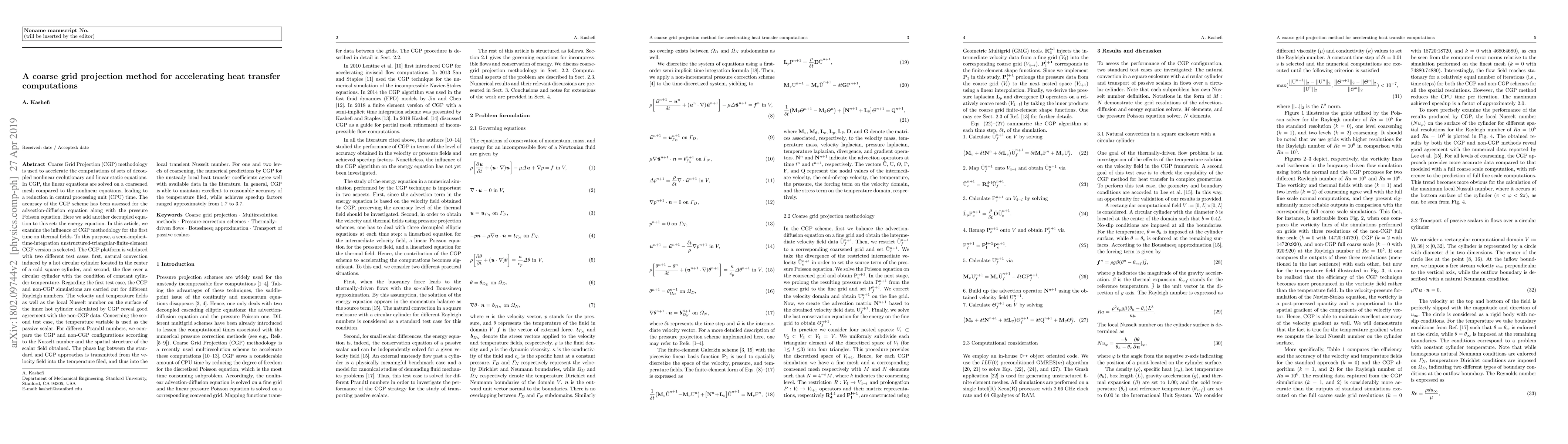 Coarse Grid Projection (CGP) methodology is used to accelerate the computations of sets of decoupled nonlinear evolutionary and linear static equations. In CGP, the linear equations are solved on a coarsened mesh compared to the nonlinear equations, leading to a reduction in central processing unit (CPU) time. The accuracy of the CGP scheme has been assessed for the advection-diffusion equation along with the pressure Poisson equation. Here we add another decoupled equation to this set: the energy equation. In this article, we examine the influence of CGP methodology for the first time on thermal fields. To this purpose, a semi-implicit-time-integration unstructured-triangular-finite-element CGP version is selected. The CGP platform is validated with two different test cases: first, natural convection induced by a hot circular cylinder located in the center of a cold square cylinder, and second, the flow over a circular cylinder with the condition of constant cylinder temperature. Regarding the first test case, the CGP and non-CGP simulations are carried out for different Rayleigh numbers. The velocity and temperature fields as well as the local Nusselt number on the surface of the inner hot cylinder calculated by CGP reveal good agreement with the non-CGP data. Concerning the second test case, the temperature variable is used as the passive scalar. For different Prandtl numbers, we compare the CGP and non-CGP configurations according to the Nusselt number and the spatial structure of the scalar field obtained. The phase lag between the standard and CGP approaches is transmitted from the velocity field into the temperature filed, and thus into the local transient Nusselt number. For one and two levels of coarsening, the numerical predictions by CGP for the unsteady local heat transfer coefficients agree well with available data in the literature.