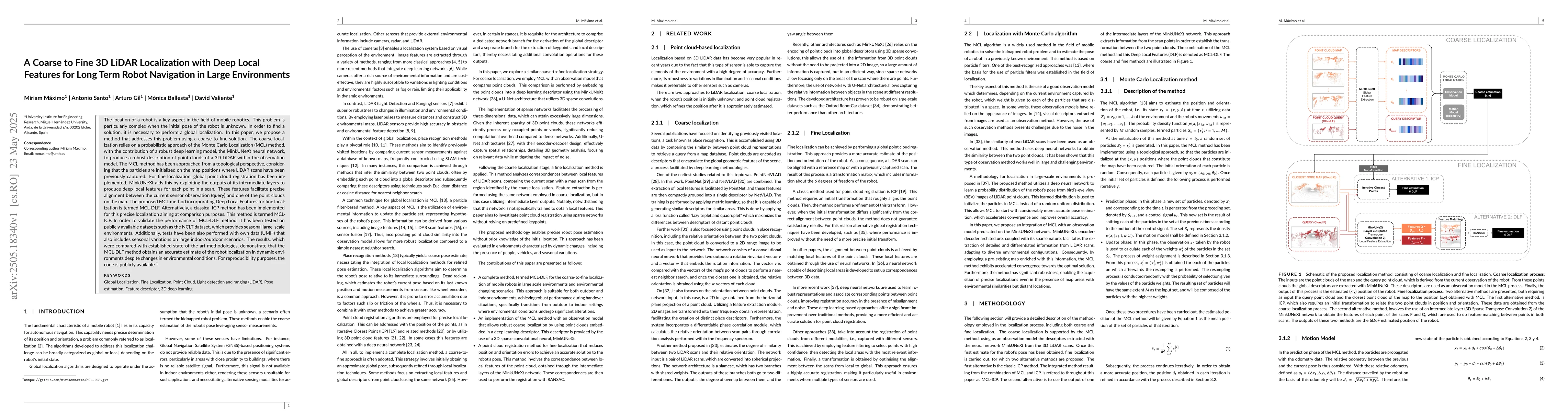 The research proposes a coarse-to-fine localization method for robots using 3D LiDAR, combining Monte Carlo Localization (MCL) with a deep learning model, MinkUNeXt, for robust point cloud description. Fine localization is achieved through global point cloud registration, aided by deep local features generated from MinkUNeXt's intermediate layers. The method is compared with the Iterative Closest Point (ICP) algorithm.