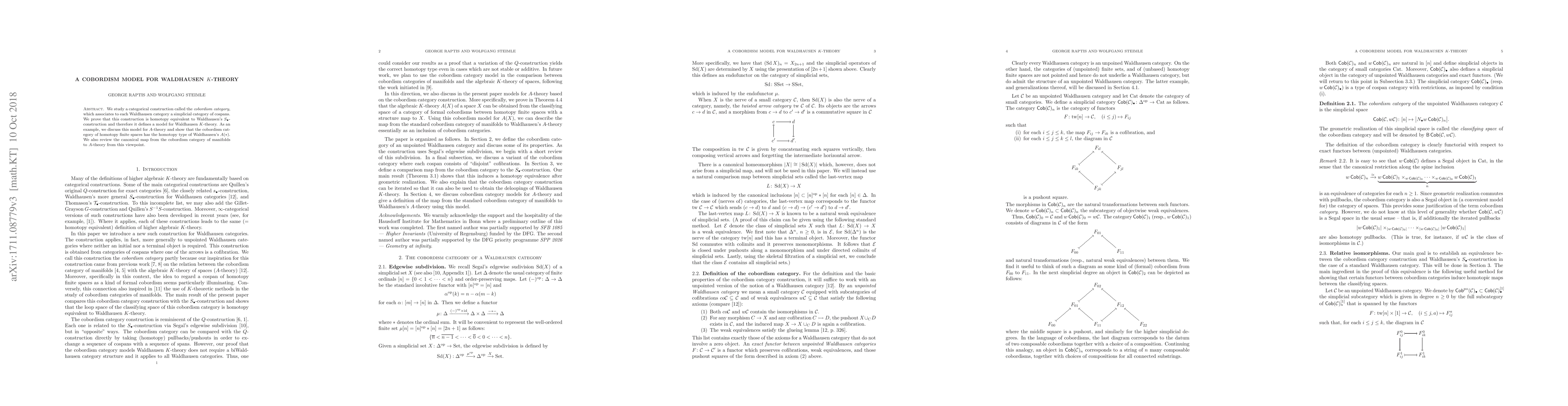 This paper constructs a cobordism category for Waldhausen categories and demonstrates its homotopy equivalence to Waldhausen's $S_{\bullet}$-construction, thereby serving as a model for Waldhausen $K$-theory. The authors apply this model to $A$-theory, showing that the cobordism category of homotopy finite spaces matches Waldhausen's $A(*)$ and review the canonical map from the cobordism category of manifolds.