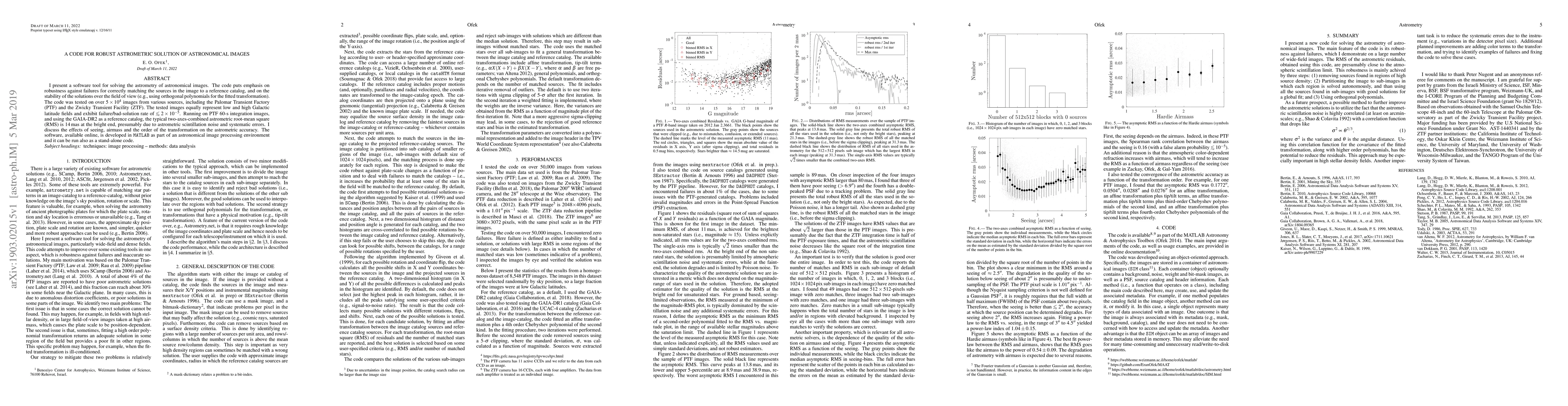 I present a software tool for solving the astrometry of astronomical images. The code puts emphasis on robustness against failures for correctly matching the sources in the image to a reference catalog, and on the stability of the solutions over the field of view (e.g., using orthogonal polynomials for the fitted transformation). The code was tested on over 50,000 images from various sources, including the Palomar Transient Factory (PTF) and the Zwicky Transient Facility (ZTF). The tested images equally represent low and high Galactic latitude fields and exhibit failure/bad-solution rate of <2x10^-5. Running on PTF 60-s integration images, and using the GAIA-DR2 as a reference catalog, the typical two-axes-combined astrometric root-mean square (RMS) is 14 mas at the bright end, presumably due to astrometric scintillation noise and systematic errors. I discuss the effects of seeing, airmass and the order of the transformation on the astrometric accuracy. The software, available online, is developed in MATLAB as part of an astronomical image processing environment and it can be run also as a stand-alone code.