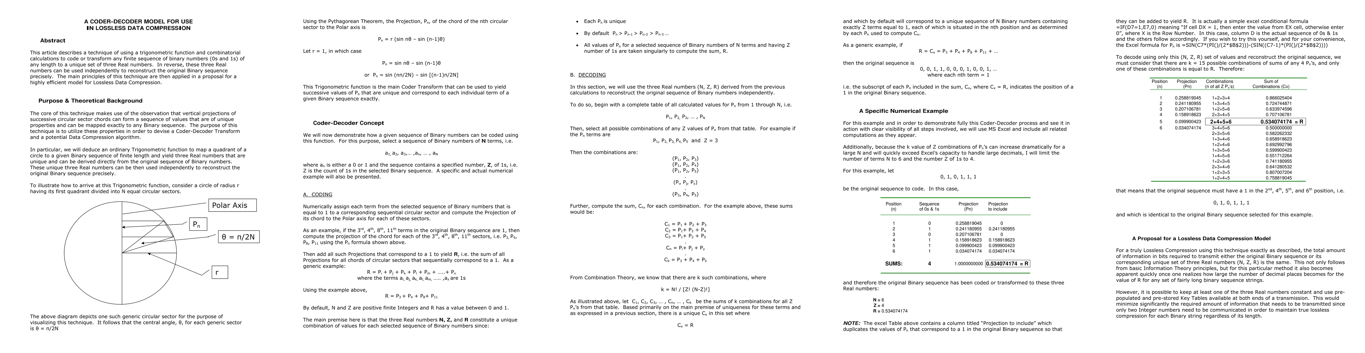 This article describes a technique of using a trigonometric function and combinatorial calculations to code or transform any finite sequence of binary numbers (0s and 1s) of any length to a unique set of three Real numbers. In reverse, these three Real numbers can be used independently to reconstruct the original Binary sequence precisely. The main principles of this technique are then applied in a proposal for a highly efficient model for Lossless Data Compression.
