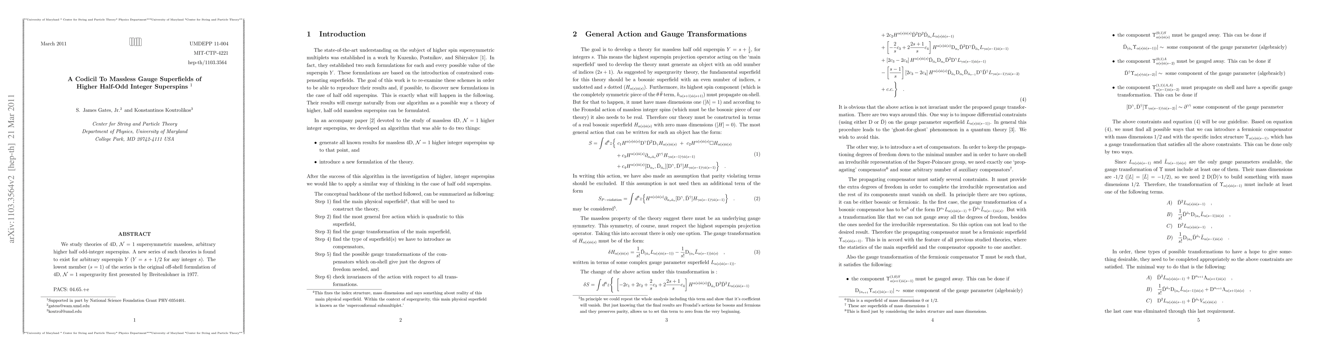 We study theories of 4D, N=1 supersymmetric massless, arbitrary higher half odd-integer superspins. A new series of such theories is found to exist for arbitrary superspin Y (Y=s+1/2 for any integer s). The lowest member (s=1) of the series is the original off-shell formulation of 4D, N=1 supergravity first presented by Breitenlohner in 1977.