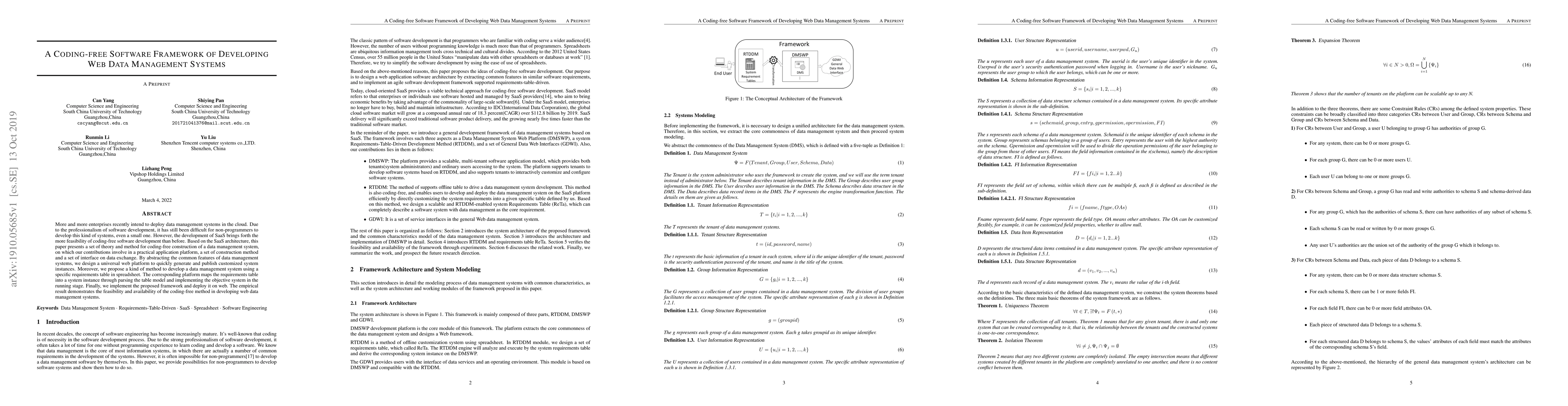 This paper introduces a coding-free software framework for developing web-based data management systems, leveraging SaaS architecture. The framework enables non-programmers to create customized systems using a spreadsheet-based method, demonstrating feasibility through practical implementation and deployment.
