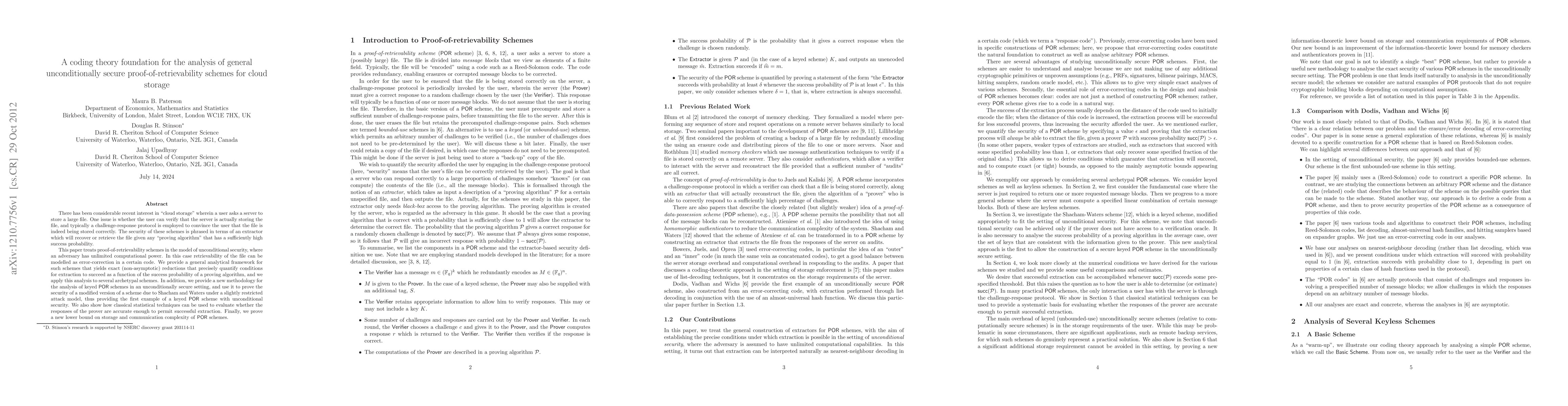 This paper presents a coding theory-based framework for analyzing unconditionally secure proof-of-retrievability schemes in cloud storage, offering exact reductions for file extraction success based on proving algorithm success probability. It introduces a new analysis method for keyed POR schemes, proving the security of a Shacham-Waters modification under a restricted attack model – the first unconditionally secure keyed POR scheme example. The study also demonstrates the use of classical statistics for evaluating prover response accuracy and establishes a new lower bound on storage and communication complexity for POR schemes.