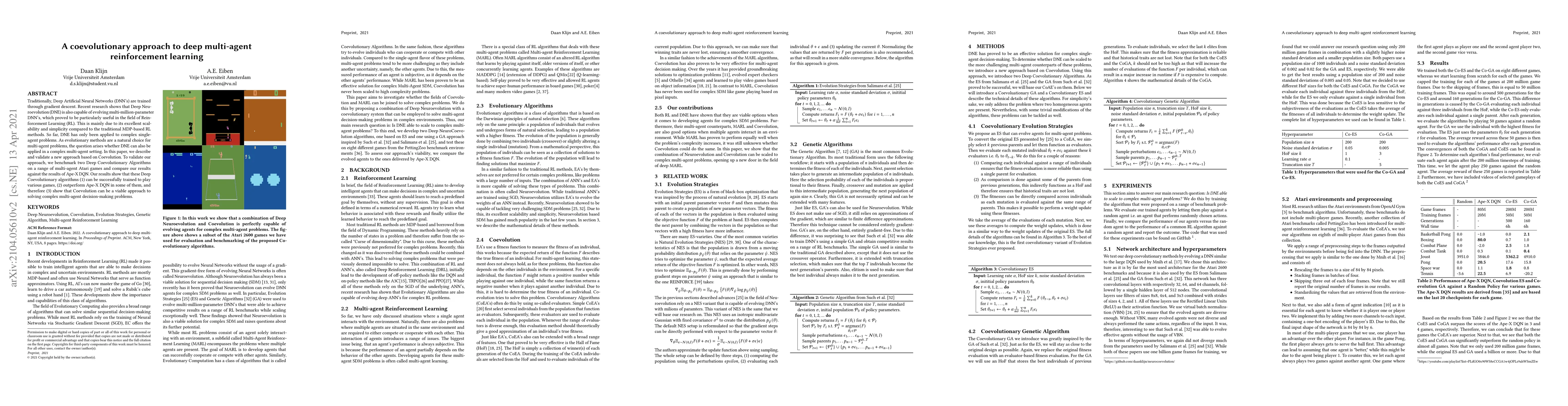This paper proposes a coevolutionary approach for deep multi-agent reinforcement learning, demonstrating its effectiveness through experiments on multi-agent Atari games. The results show that the coevolutionary algorithms outperform traditional DQN methods in some games, indicating coevolution's potential for complex multi-agent decision-making.