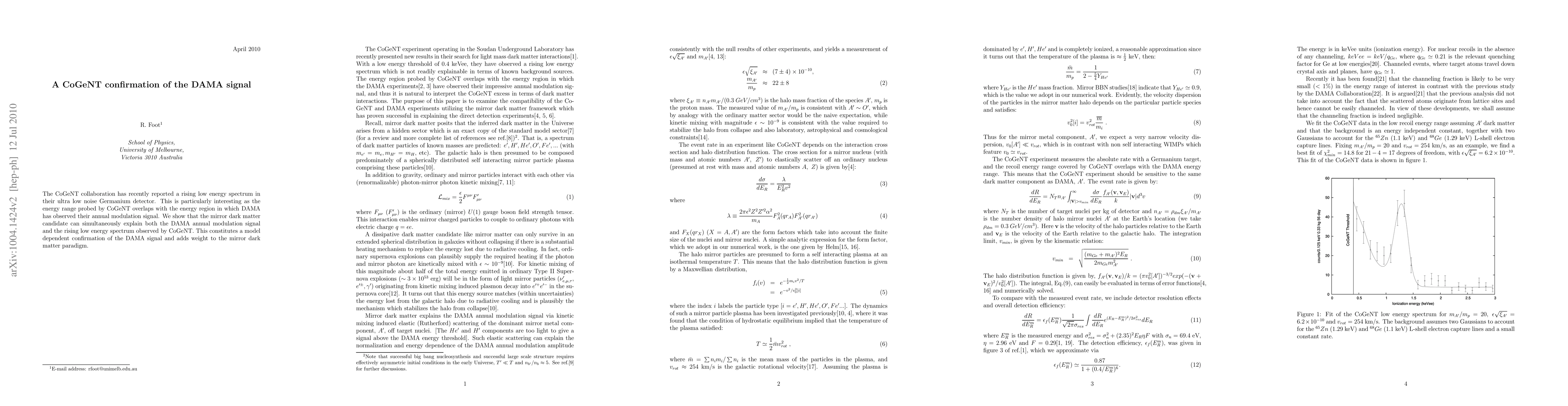 The CoGeNT collaboration has recently reported a rising low energy spectrum in their ultra low noise germanium detector. This is particularly interesting as the energy range probed by CoGeNT overlaps with the energy region in which DAMA has observed their annual modulation signal. We show that the mirror dark matter candidate can simultaneously explain both the DAMA annual modulation signal and the rising low energy spectrum observed by CoGeNT. This constitutes a model dependent confirmation of the DAMA signal and adds weight to the mirror dark matter paradigm.