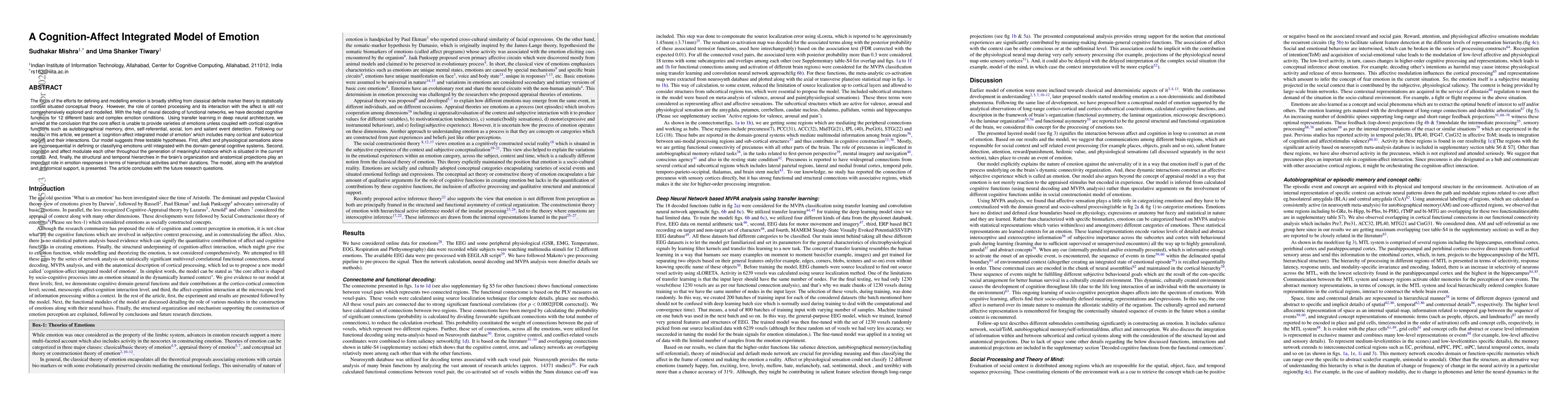The focus of the efforts for defining and modelling emotion is broadly shifting from classical definite marker theory to statistically context situated conceptual theory. However, the role of context processing and its interaction with the affect is still not comprehensively explored and modelled. With the help of neural decoding of functional networks, we have decoded cognitive functions for 12 different basic and complex emotion conditions. Using transfer learning in deep neural architecture, we arrived at the conclusion that the core affect is unable to provide varieties of emotions unless coupled with cortical cognitive functions such as autobiographical memory, dmn, self-referential, social, tom and salient event detection. Following our results, in this article, we present a 'cognition-affect integrated model of emotion' which includes many cortical and subcortical regions and their interactions. Our model suggests three testable hypotheses. First, affect and physiological sensations alone are inconsequential in defining or classifying emotions until integrated with the domain-general cognitive systems. Second, cognition and affect modulate each other throughout the generation of meaningful instance which is situated in the current context. And, finally, the structural and temporal hierarchies in the brain's organization and anatomical projections play an important role in emotion responses in terms of hierarchical activities and their durations. The model, along with the analytical and anatomical support, is presented. The article concludes with the future research questions.