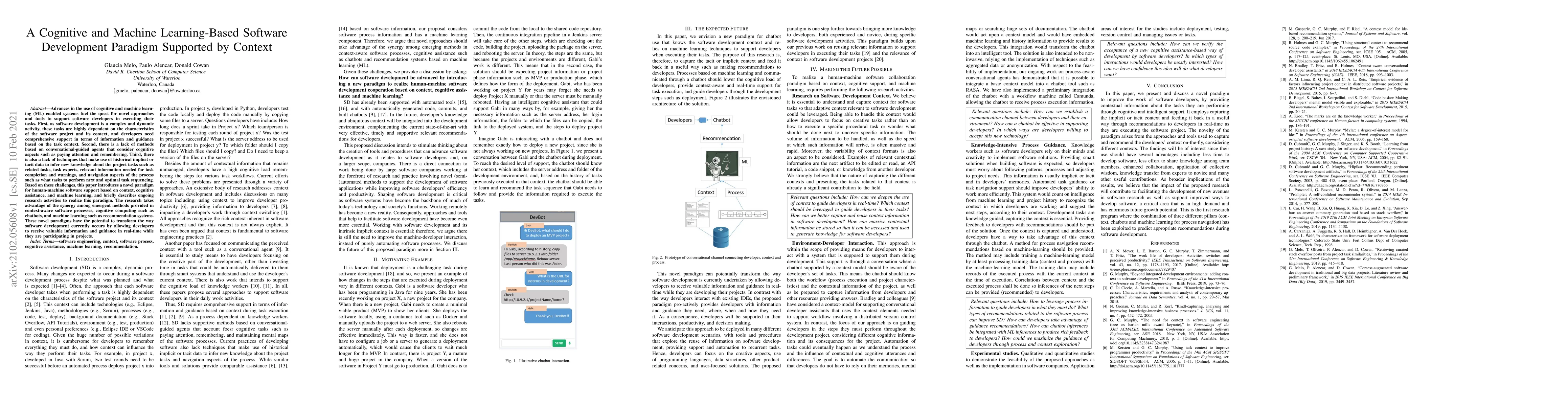 This paper proposes a novel software development paradigm leveraging cognitive computing and machine learning to provide contextual, real-time guidance and support to developers, addressing the lack of conversational-guided agents and techniques utilizing historical data for task completion. The research aims to enhance software development through context-aware processes, chatbots, and recommendation systems.