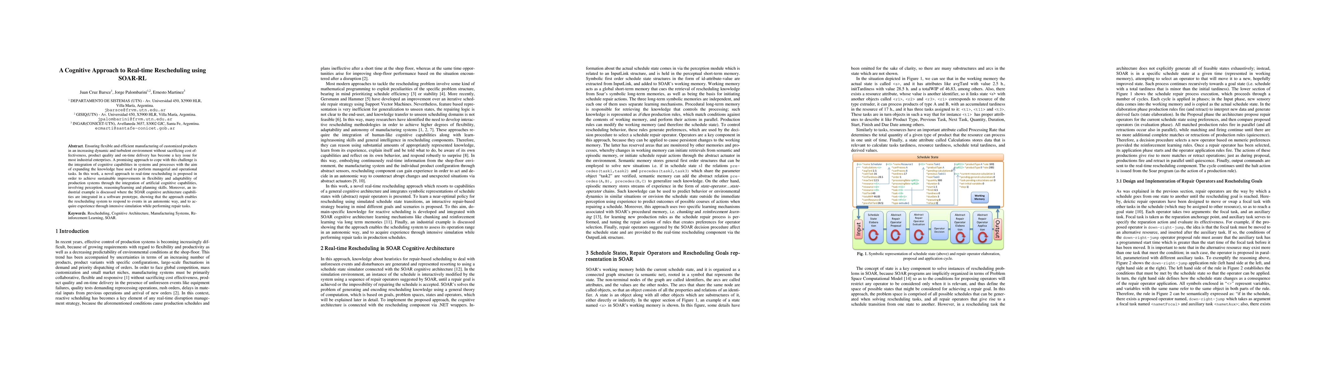 This paper proposes a cognitive approach using SOAR-RL for real-time rescheduling in manufacturing to enhance flexibility and adaptability. The method integrates perception, reasoning, learning, and planning to improve production system responsiveness and adaptability, demonstrated through an industrial prototype.