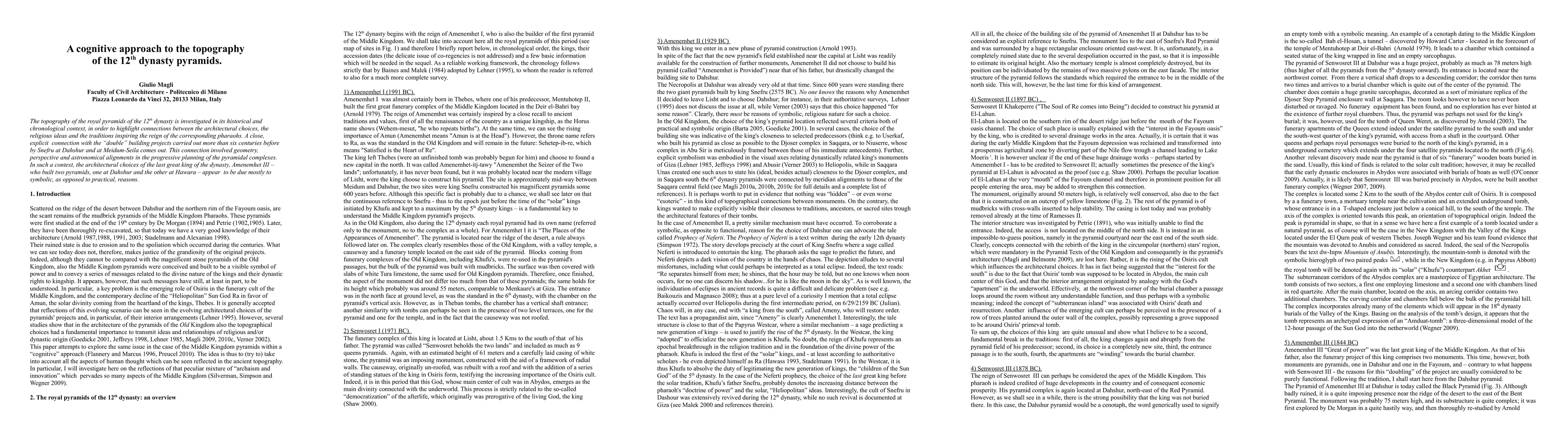 This paper explores the historical and architectural context of the 12th dynasty pyramids, emphasizing their symbolic connections to earlier projects by Snefru. It highlights how Amenemhet III's pyramid constructions reflect deeper religious and traditional influences rather than practical considerations.