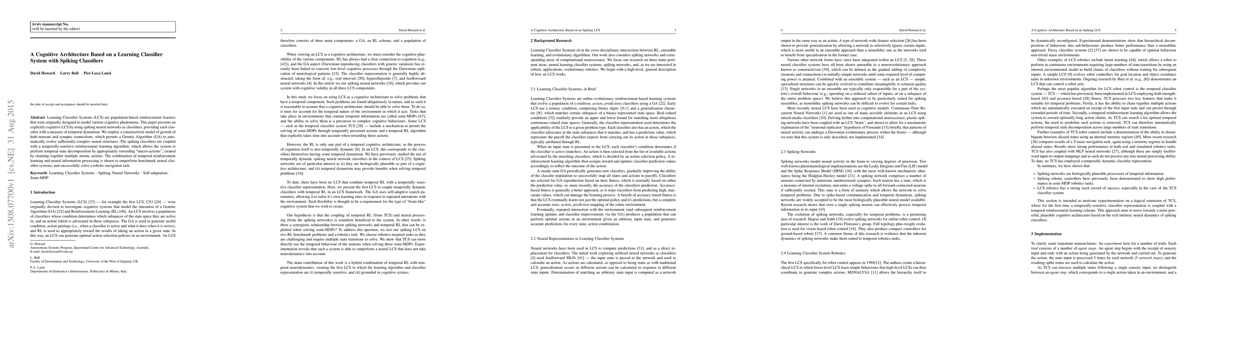 Learning Classifier Systems (LCS) are population-based reinforcement learners that were originally designed to model various cognitive phenomena. This paper presents an explicitly cognitive LCS by using spiking neural networks as classifiers, providing each classifier with a measure of temporal dynamism. We employ a constructivist model of growth of both neurons and synaptic connections, which permits a Genetic Algorithm (GA) to automatically evolve sufficiently-complex neural structures. The spiking classifiers are coupled with a temporally-sensitive reinforcement learning algorithm, which allows the system to perform temporal state decomposition by appropriately rewarding "macro-actions," created by chaining together multiple atomic actions. The combination of temporal reinforcement learning and neural information processing is shown to outperform benchmark neural classifier systems, and successfully solve a robotic navigation task.