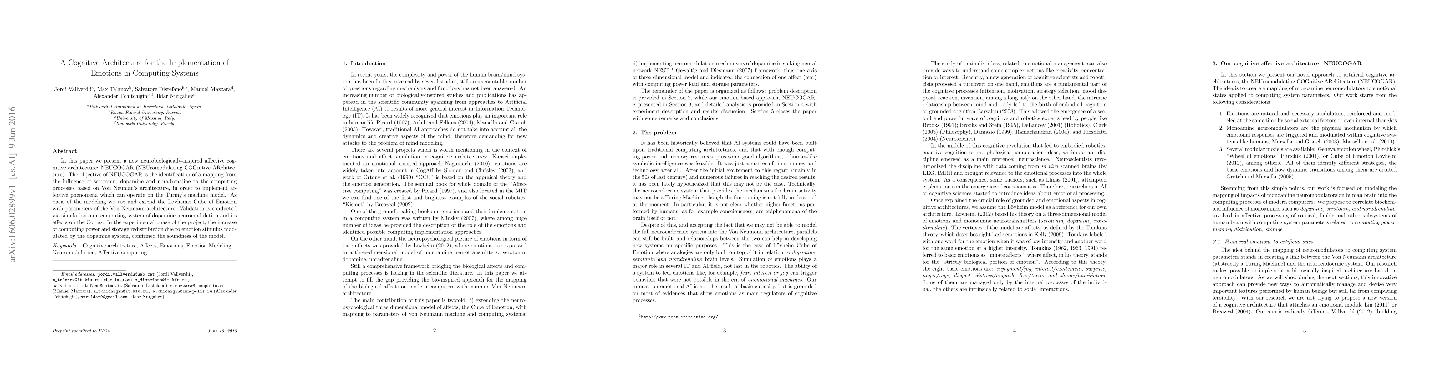 This paper introduces NEUCOGAR, a neurobiologically-inspired cognitive architecture designed to implement emotions in computing systems by mapping neuromodulators like serotonin, dopamine, and noradrenaline to Von Neumann processes. Simulation results show increased computing power and storage redistribution due to dopamine-modulated emotional stimuli, validating the model's effectiveness.