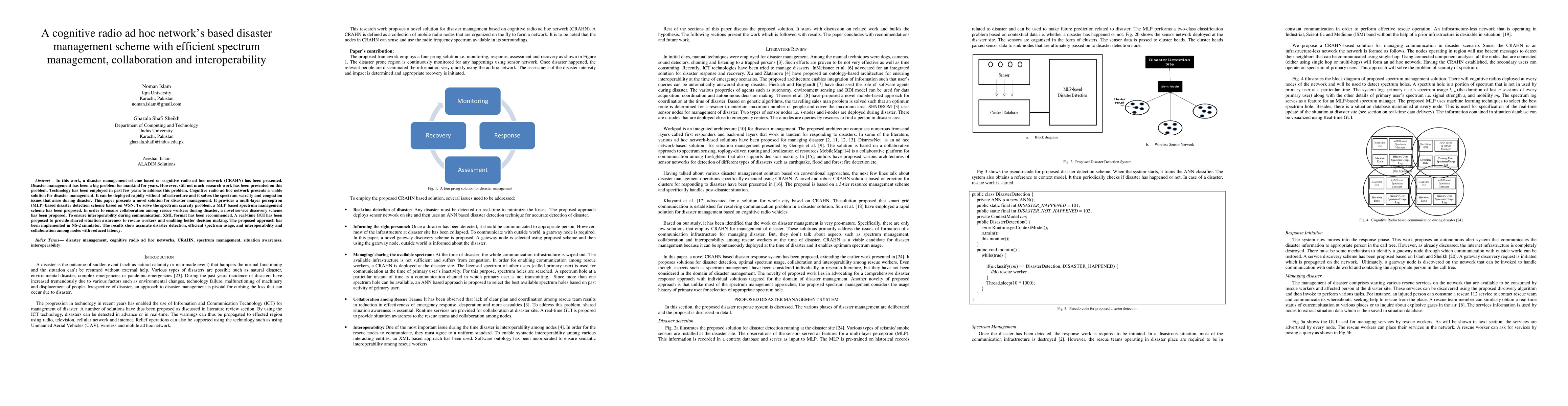 In this work, a disaster management scheme based on cognitive radio ad hoc network (CRAHN) has been presented. Disaster management has been a big problem for mankind for years. However, still not much research work has been presented on this problem. Technology has been employed in past few years to address this problem. Cognitive radio ad hoc network presents a viable solution for disaster management. It can be deployed rapidly without infrastructure and it solves the spectrum scarcity and congestion issues that arise during disaster. This paper presents a novel solution for disaster management. It provides a multi-layer perceptron (MLP) based disaster detection scheme based on WSN. To solve the spectrum scarcity problem, a MLP based spectrum management scheme has been proposed. In order to ensure collaboration among rescue workers during disaster, a novel service discovery scheme has been proposed. To ensure interoperability during communication, XML format has been recommended. A real-time GUI has been proposed to provide shared situation awareness to rescue workers and enabling better decision making. The proposed approach has been implemented in NS-2 simulator. The results show accurate disaster detection, efficient spectrum usage, and interoperability and collaboration among nodes with reduced latency.