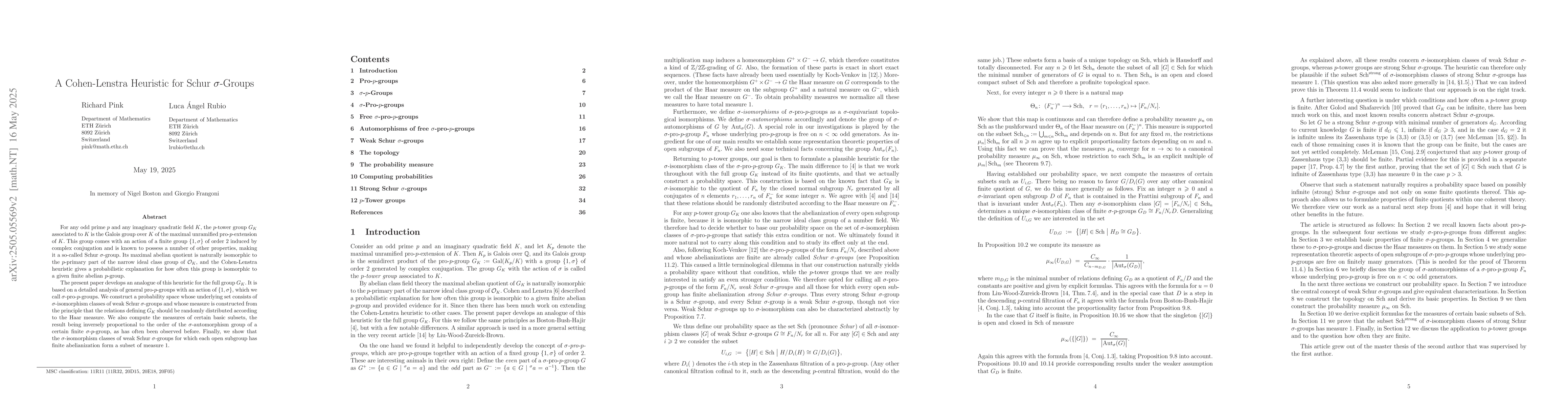 For any odd prime $p$ and any imaginary quadratic field $K$, the $p$-tower group $G_K$ associated to $K$ is the Galois group over $K$ of the maximal unramified pro-$p$-extension of $K$. This group comes with an action of a finite group $\{1,\sigma\}$ of order $2$ induced by complex conjugation and is known to possess a number of other properties, making it a so-called Schur $\sigma$-group. Its maximal abelian quotient is naturally isomorphic to the $p$-primary part of the narrow ideal class group of ${\mathcal O}_K$, and the Cohen-Lenstra heuristic gives a probabilistic explanation for how often this group is isomorphic to a given finite abelian $p$-group. The present paper develops an analogue of this heuristic for the full group $G_K$. It is based on a detailed analysis of general pro-$p$-groups with an action of $\{1,\sigma\}$, which we call $\sigma$-pro-$p$-groups. We construct a probability space whose underlying set consists of $\sigma$-isomorphism classes of weak Schur $\sigma$-groups and whose measure is constructed from the principle that the relations defining $G_K$ should be randomly distributed according to the Haar measure. We also compute the measures of certain basic subsets, the result being inversely proportional to the order of the $\sigma$-automorphism group of a certain finite $\sigma$-$p$-group, as has often been observed before. Finally, we show that the $\sigma$-isomorphism classes of weak Schur $\sigma$-groups for which each open subgroup has finite abelianization form a subset of measure $1$.