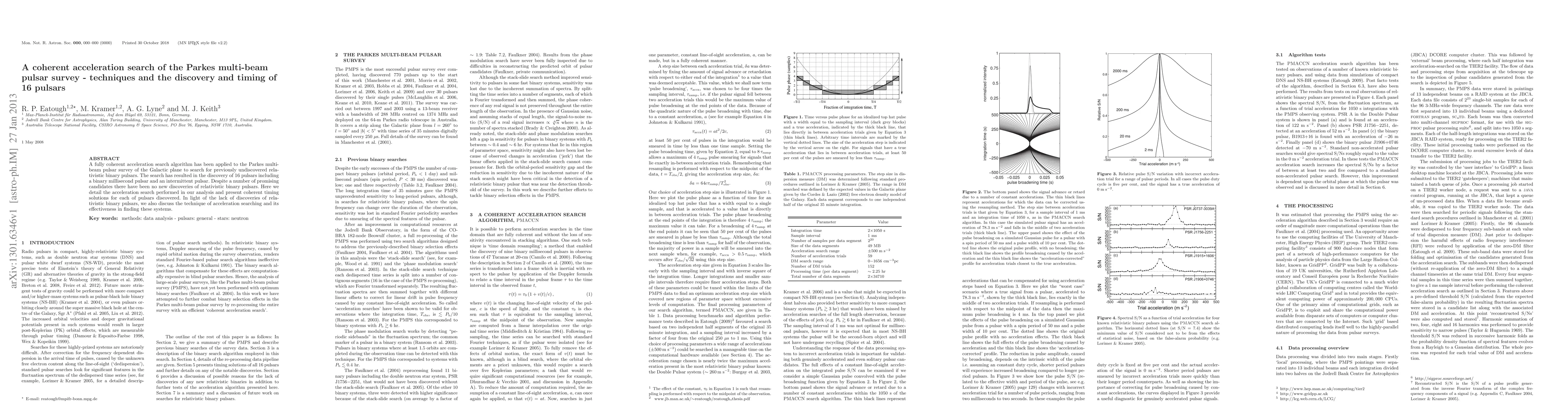 Researchers used a new algorithm to search for pulsars in the Parkes multi-beam survey, discovering 16 pulsars including two rare types, but found no new relativistic binary pulsars.