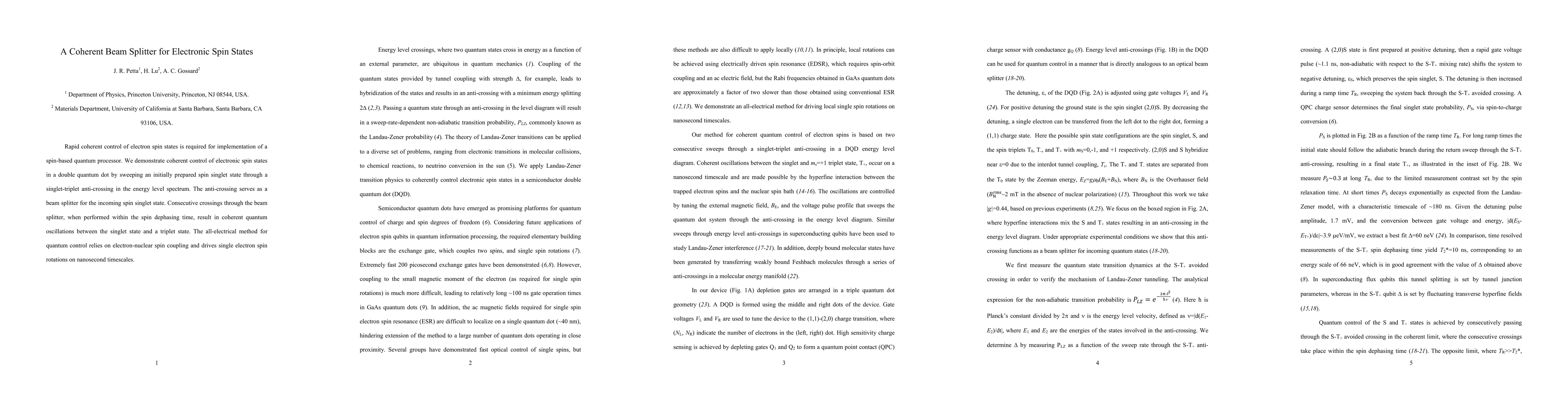 This paper presents a method for coherent control of electronic spin states in a double quantum dot by using an energy level anti-crossing as a beam splitter, enabling quantum oscillations via all-electrical means based on electron-nuclear spin coupling. The technique allows for rapid, single electron spin rotations on nanosecond timescales.