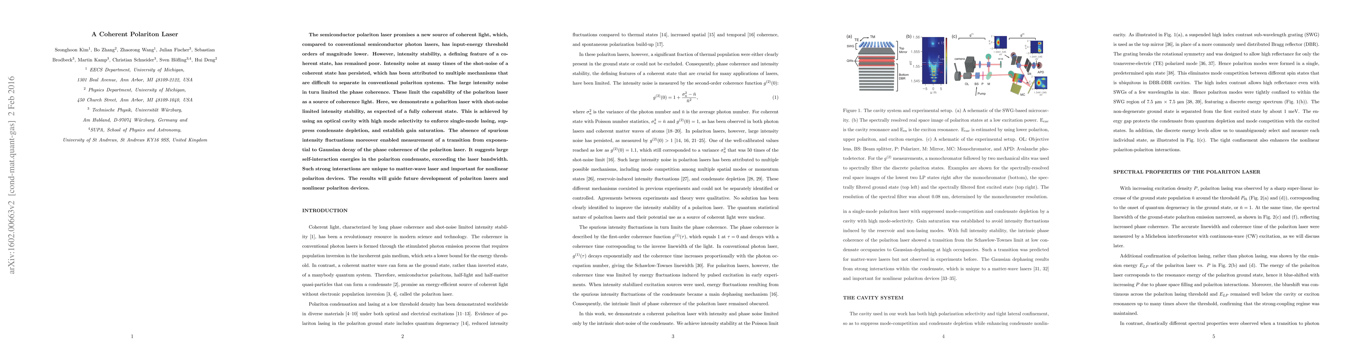 This paper demonstrates a polariton laser with shot-noise limited intensity stability, overcoming previous stability issues. The use of a high mode selectivity optical cavity enables single-mode lasing, suppressing condensate depletion and enhancing phase coherence, which is crucial for future nonlinear polariton devices.