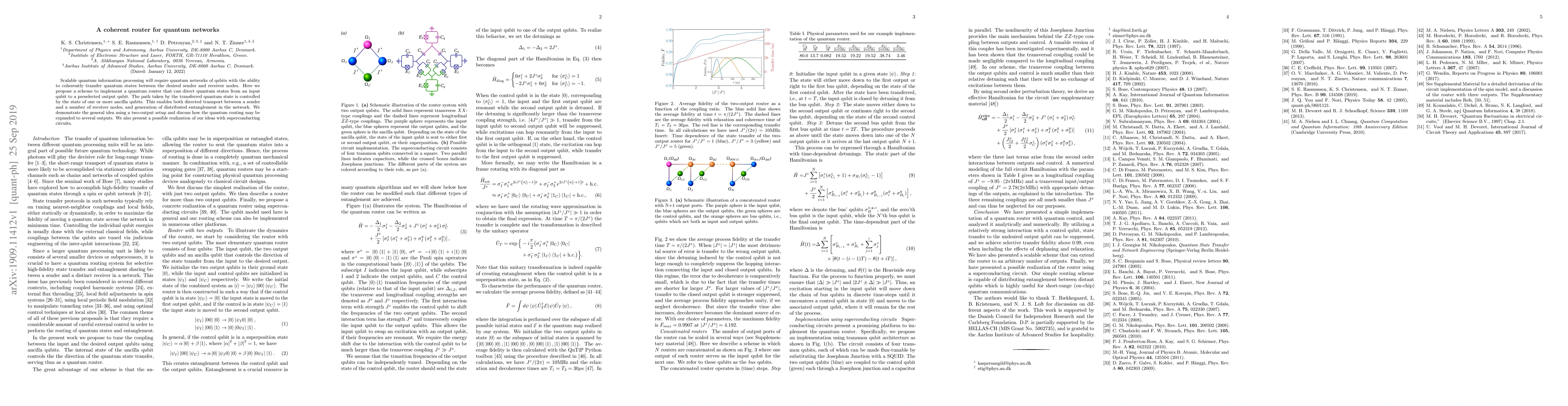 This paper proposes a quantum router scheme to coherently transfer quantum states between sender and receiver nodes in quantum networks, utilizing ancilla qubits to control the path. The authors demonstrate the concept with a two-output setup and discuss its expansion to multiple outputs, along with a potential realization using superconducting circuits.