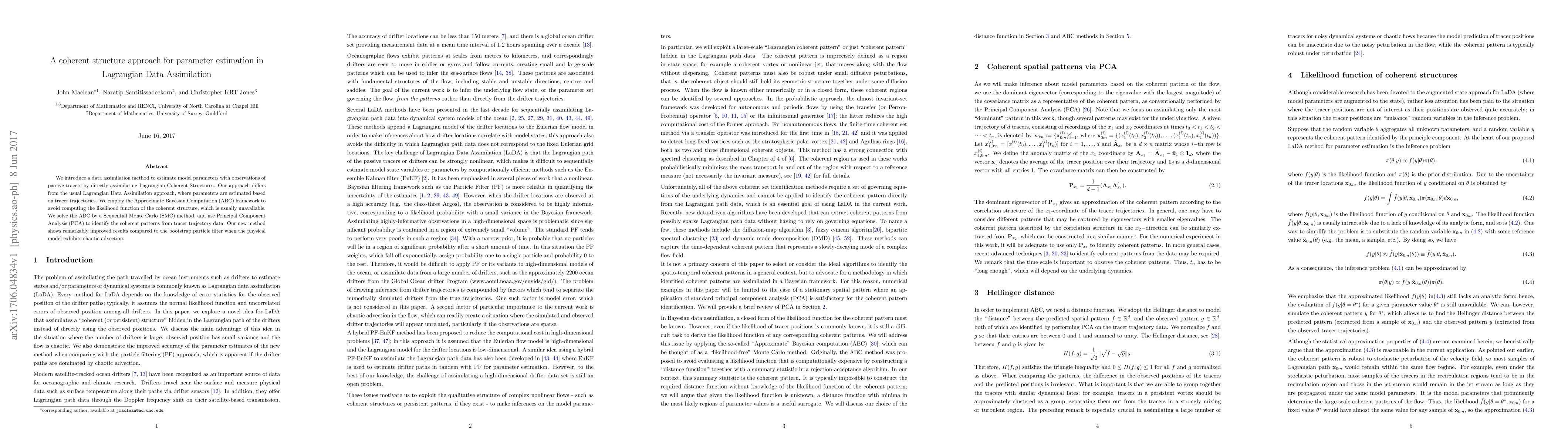 This paper proposes a novel data assimilation method using Lagrangian Coherent Structures for parameter estimation in chaotic advection models, leveraging Approximate Bayesian Computation and Sequential Monte Carlo techniques to avoid direct likelihood computation, showing improved performance over traditional methods.