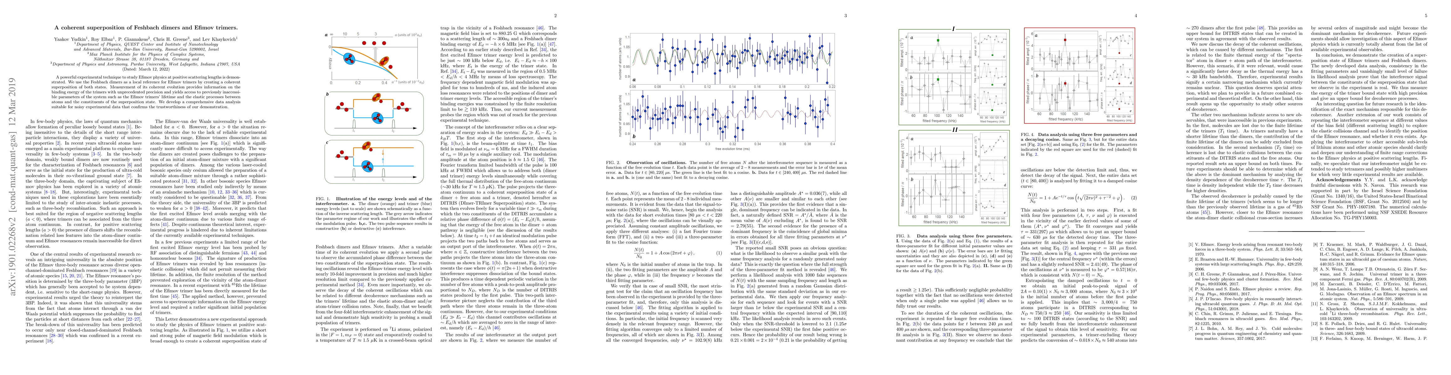 This paper demonstrates an experimental technique to study Efimov physics using Feshbach dimers as a reference, creating a coherent superposition of dimers and trimers. The precise measurement of this superposition's evolution reveals the trimers' binding energy, lifetime, and elastic processes, validated by robust data analysis.