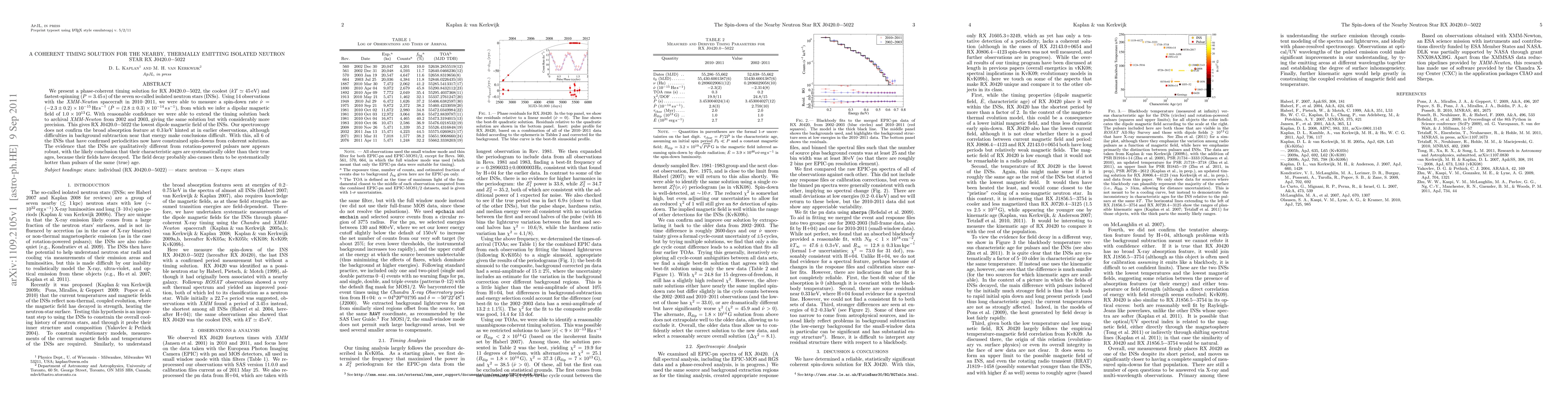 We present a phase-coherent timing solution for RX J0420.0-5022, the coolest (kT=45 eV) and fastest-spinning (P=3.45 s) of the seven so-called isolated neutron stars (INSs). Using 14 observations with the XMM-Newton spacecraft in 2010-2011, we were able to measure a spin-down rate nudot=(-2.3+/-0.2)e-15 Hz/s (Pdot=(2.8+/-0.3)e-14 s/s), from which we infer a dipolar magnetic field of 1.0e13 G. With reasonable confidence we were able to extend the timing solution back to archival XMM-Newton from 2002 and 2003, giving the same solution but with considerably more precision. This gives RX J0420 the lowest dipole magnetic field of the INSs. Our spectroscopy does not confirm the broad absorption feature at 0.3 keV hinted at in earlier observations, although difficulties in background subtraction near that energy make conclusions difficult. With this, all 6 of the INSs that have confirmed periodicities now have constrained spin-downs from coherent solutions. The evidence that the INSs are qualitatively different from rotation-powered pulsars now appears robust, with the likely conclusion that their characteristic ages are systematically older than their true ages, because their fields have decayed. The field decay probably also causes them to be systematically hotter than pulsars of the same (true) age.