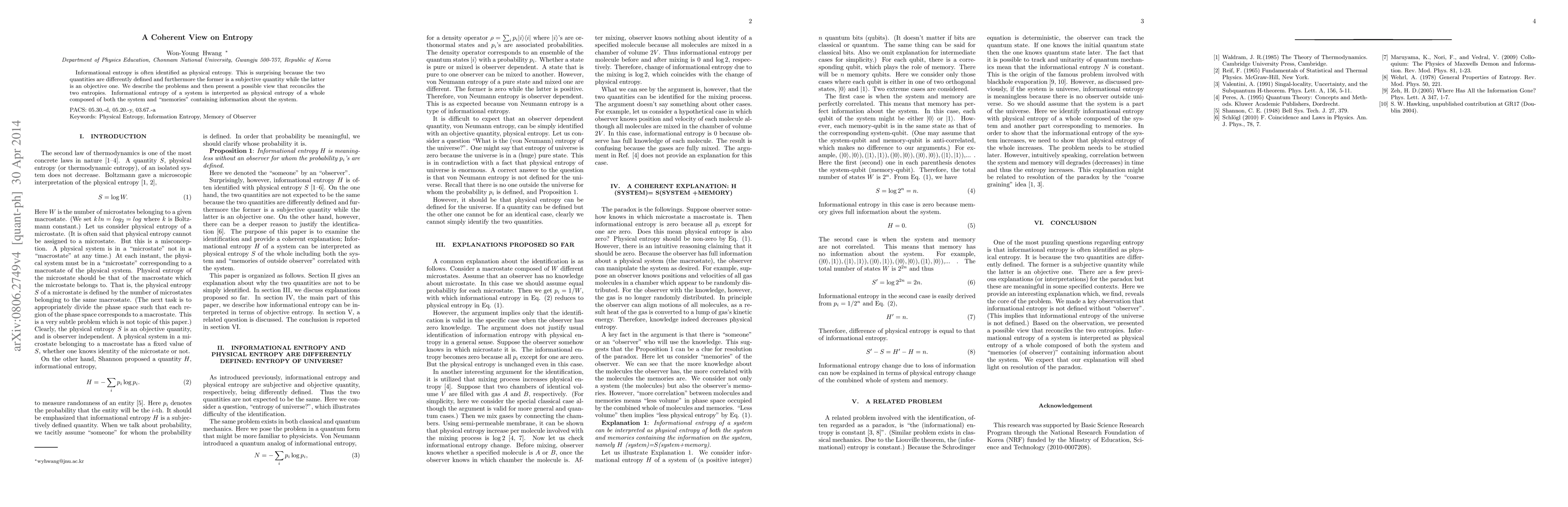 Informational entropy is often identified as physical entropy. This is surprising because the two quantities are differently defined and furthermore the former is a subjective quantity while the latter is an objective one. We describe the problems and then present a possible view that reconciles the two entropies. Informational entropy of a system is interpreted as physical entropy of a whole composed of both the system and "memories" containing information about the system.