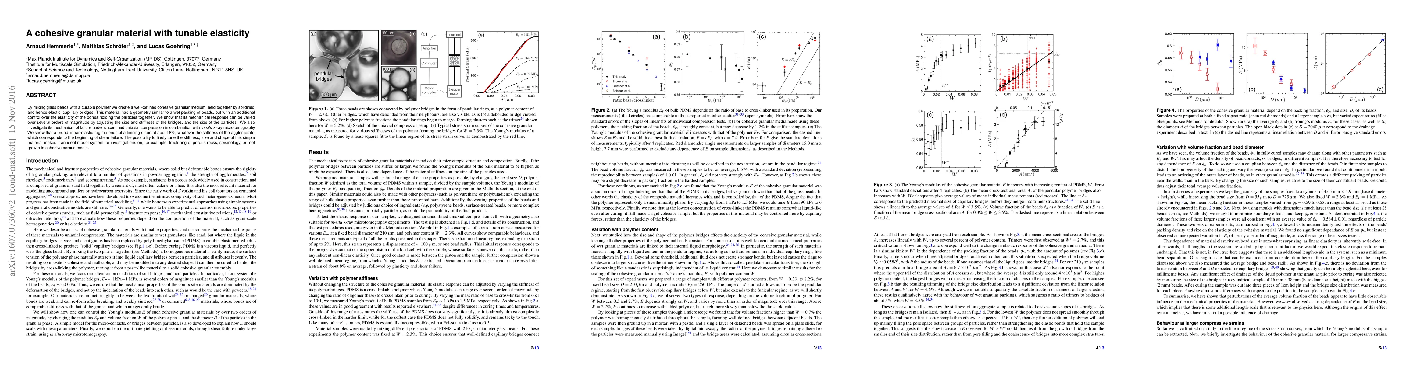 This paper presents a cohesive granular material made by mixing glass beads with a curable polymer, creating elastic capillary bridges. The material's mechanical response can be finely tuned by adjusting bead size, bridge stiffness, and geometry, making it useful for studying phenomena like fracturing and root growth in porous media.