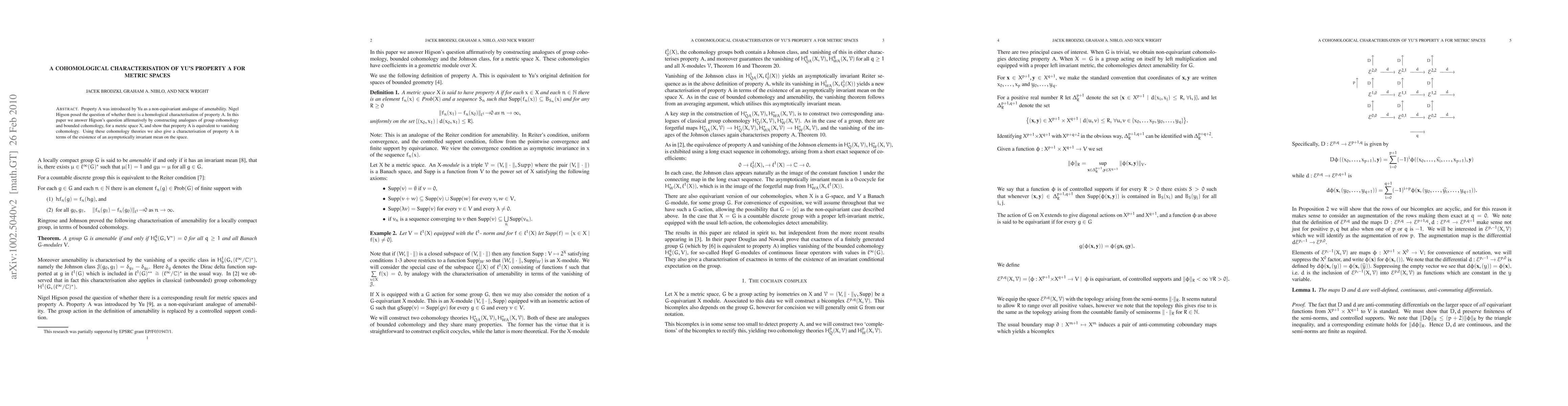 Property A was introduced by Yu as a non-equivariant analogue of amenability. Nigel Higson posed the question of whether there is a homological characterisation of property A. In this paper we answer Higson's question affirmatively by constructing analogues of group cohomology and bounded cohomology for a metric space X, and show that property A is equivalent to vanishing cohomology. Using these cohomology theories we also give a characterisation of property A in terms of the existence of an asymptotically invariant mean on the space.