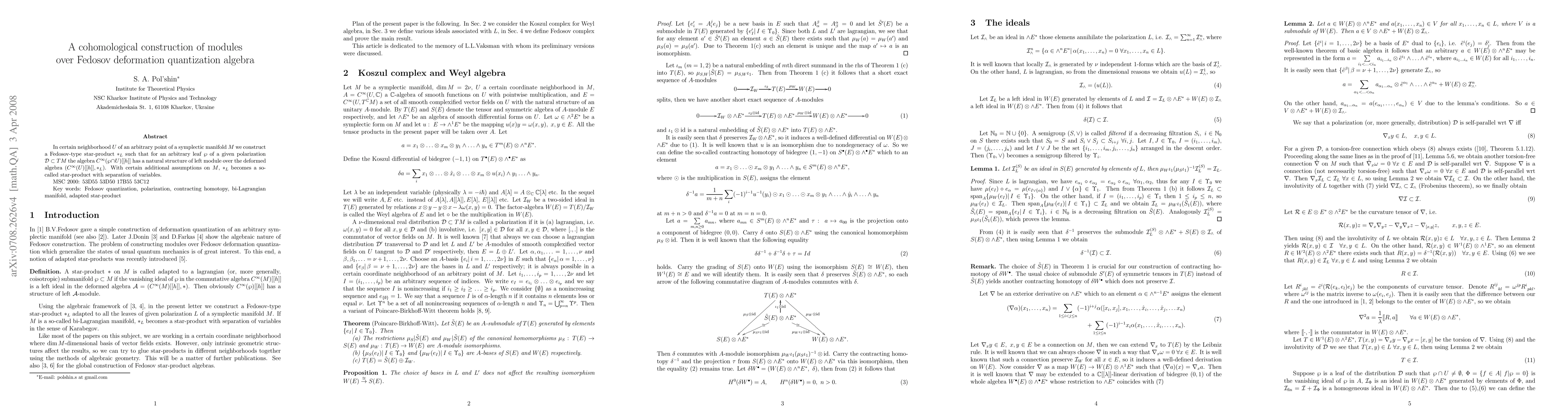 In certain neighborhood $U$ of an arbitrary point of a symplectic manifold $M$ we construct a Fedosov-type star-product $\ast_L$ such that for an arbitrary leaf $\wp$ of a given polarization $\mathcal{D}\subset TM$ the algebra $C^\infty (\wp \cap U)[[h]]$ has a natural structure of left module over the deformed algebra $(C^\infty (U)[[h]], \ast_L)$. With certain additional assumptions on $M$, $\ast_L$ becomes a so-called star-product with separation of variables.