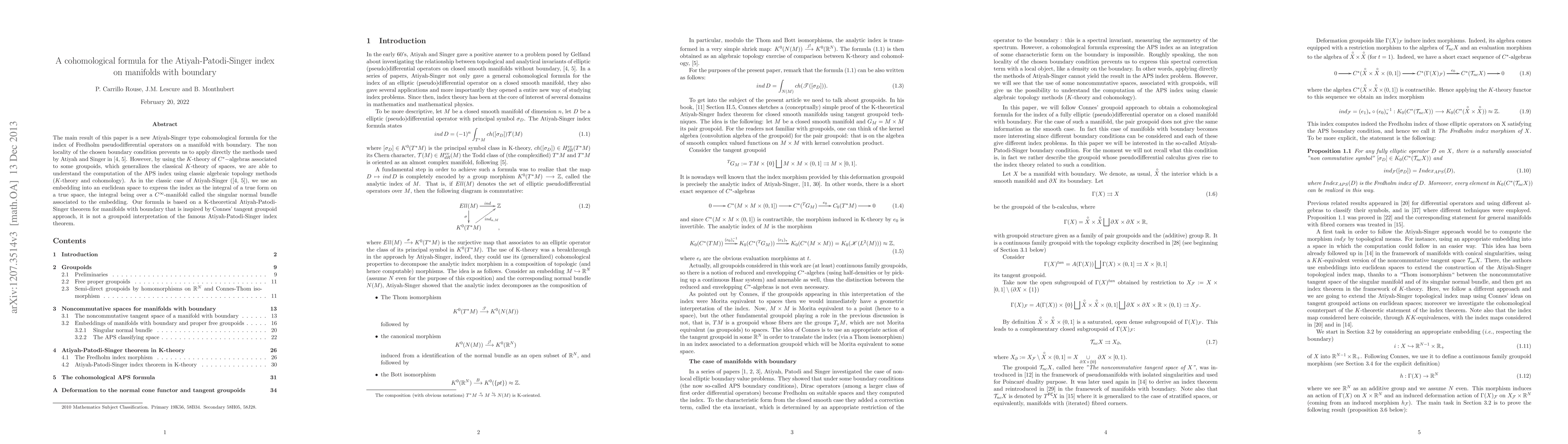 We give a cohomological formula for the index of a fully elliptic pseudodifferential operator on a manifold with boundary. As in the classic case of Atiyah-Singer, we use an embedding into an euclidean space to express the index as the integral of a cohomology class depending in this case on a noncommutative symbol, the integral being over a $C^\infty$-manifold called the singular normal bundle associated to the embedding. The formula is based on a K-theoretical Atiyah-Patodi-Singer theorem for manifolds with boundary that is drawn from Connes' tangent groupoid approach.