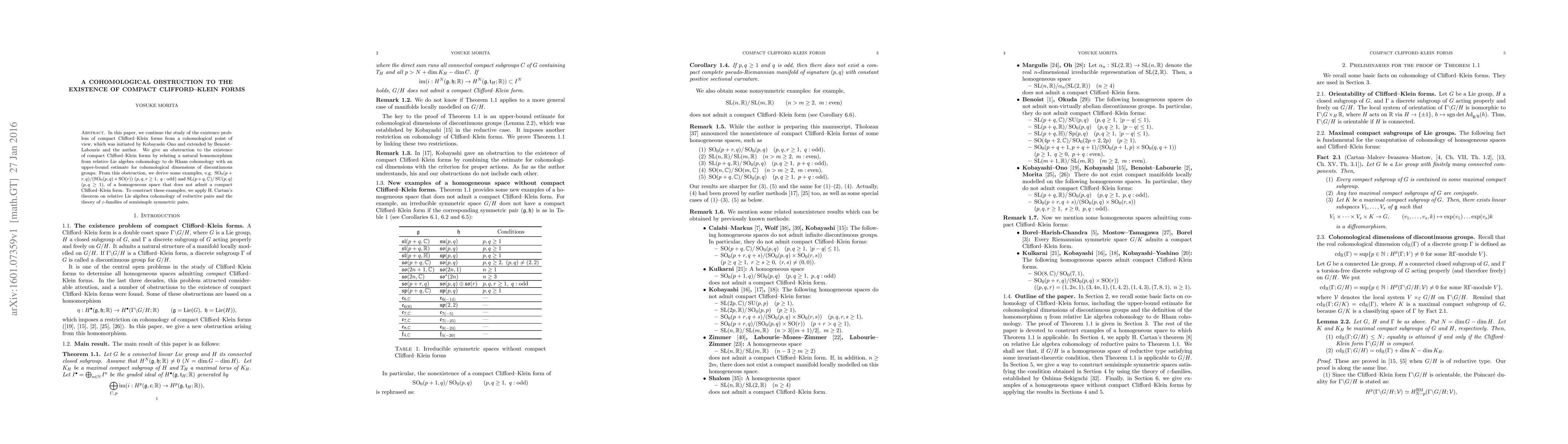 This paper provides a cohomological obstruction to the existence of compact Clifford-Klein forms by analyzing a natural homomorphism from relative Lie algebra cohomology to de Rham cohomology, leading to examples of homogeneous spaces that cannot admit such forms, including $\mathrm{SO}_0(p+r, q)/(\mathrm{SO}_0(p,q) \times \mathrm{SO}(r))$ and $\mathrm{SL}(p+q, \mathbb{C})/\mathrm{SU}(p,q)$.