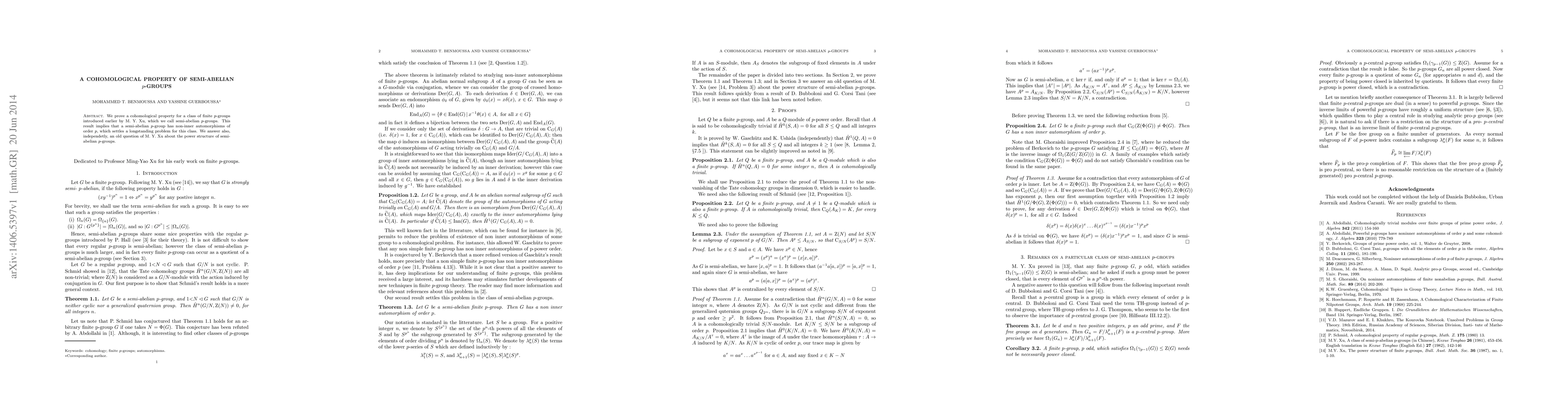 This paper establishes a cohomological property for semi-abelian $p$-groups, proving their existence of non-inner automorphisms of order $p$ and resolving a longstanding problem. Additionally, it answers an old question regarding their power structure posed by M. Y. Xu.