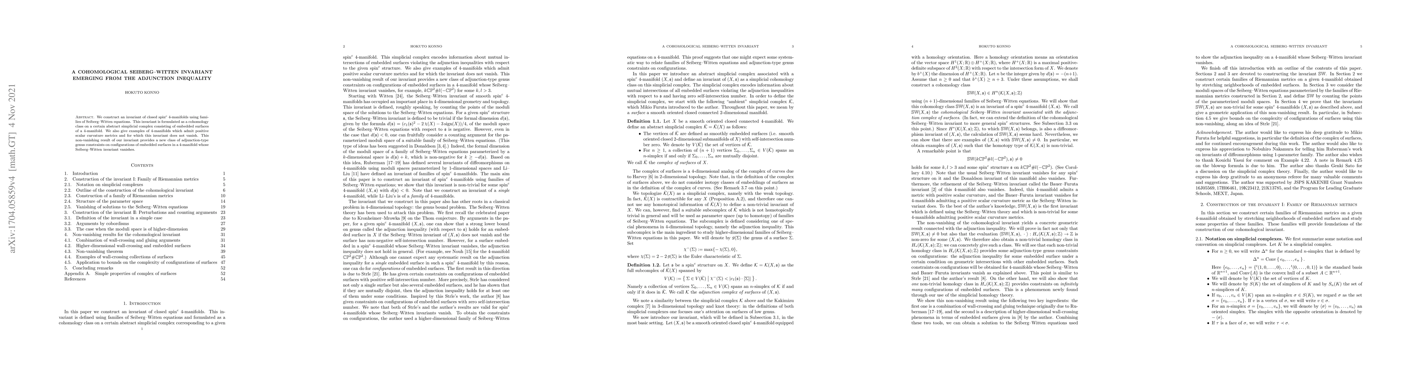 The paper constructs a new cohomological Seiberg-Witten invariant for closed spin^c 4-manifolds using families of Seiberg-Witten equations, and demonstrates its non-vanishing for certain 4-manifolds admitting positive scalar curvature metrics, providing new adjunction-type genus constraints.