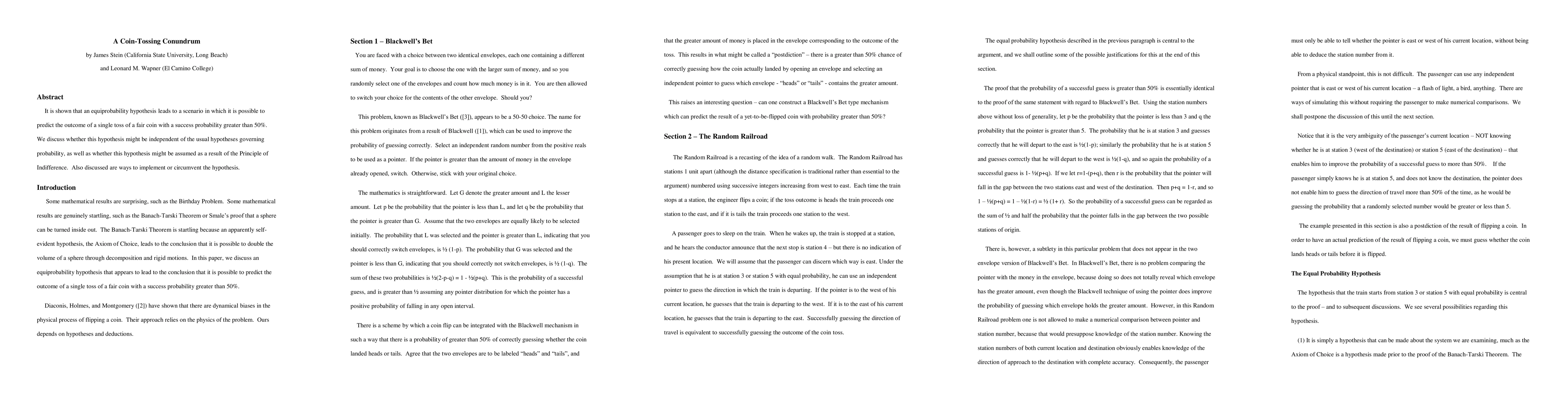 It is shown that an equiprobability hypothesis leads to a scenario in which it is possible to predict the outcome of a single toss of a fair coin with a success probability greater than 50%. We discuss whether this hypothesis might be independent of the usual hypotheses governing probability, as well as whether this hypothesis might be assumed as a result of the Principle of Indifference. Also discussed are ways to implement or circumvent the hypothesis.