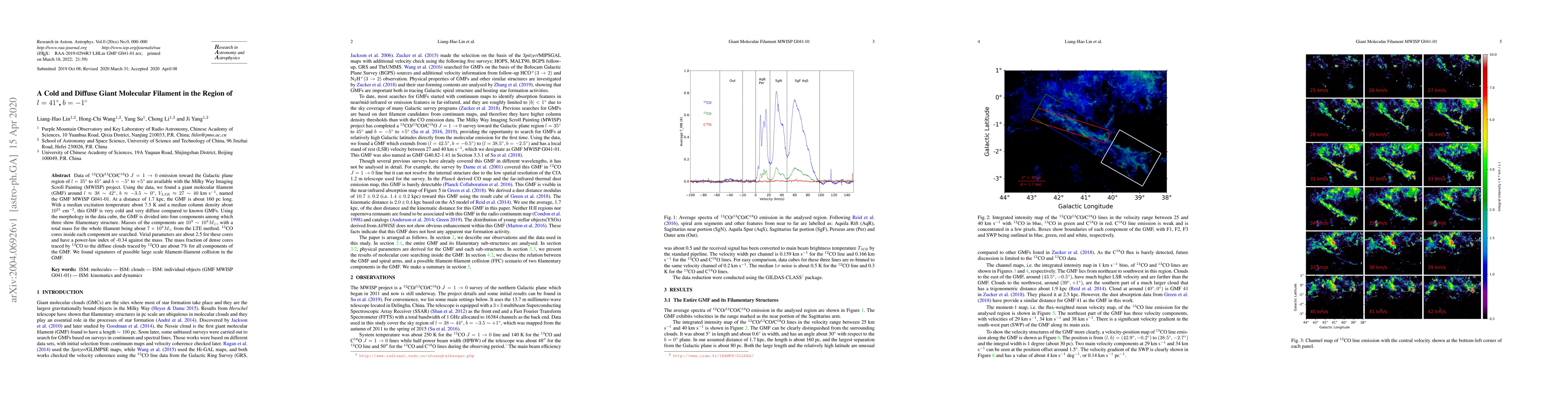 Researchers discovered a cold and diffuse giant molecular filament in the Milky Way galaxy, named GMF MWISP G041-01, which is 160 pc long and contains dense cores with masses similar to those of stars.