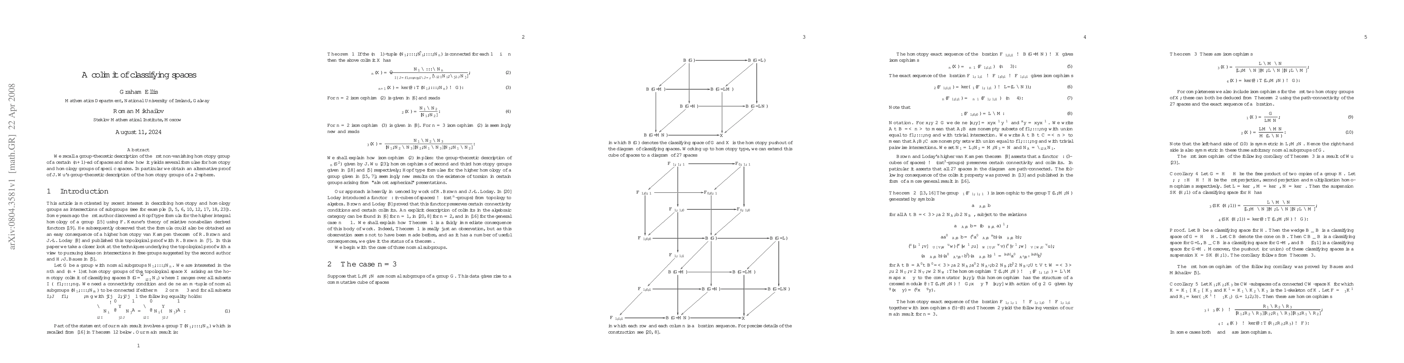Summary: This paper describes the first non-vanishing homotopy group of an (n+1)-ad of spaces using group theory and provides new formulae for homotopy and homology groups, including an alternative proof for J. Wu's description of the homotopy groups of a 2-sphere.