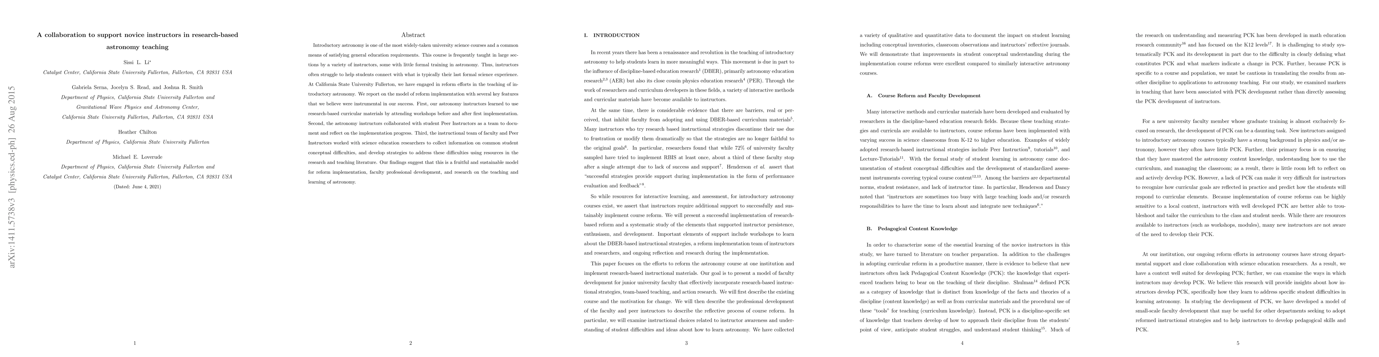 This study details a successful model for supporting novice astronomy instructors at California State University Fullerton, involving workshops, collaborative teaching with Peer Instructors, and partnerships with science education researchers to address student conceptual difficulties. The collaborative approach and professional development led to effective reform implementation.