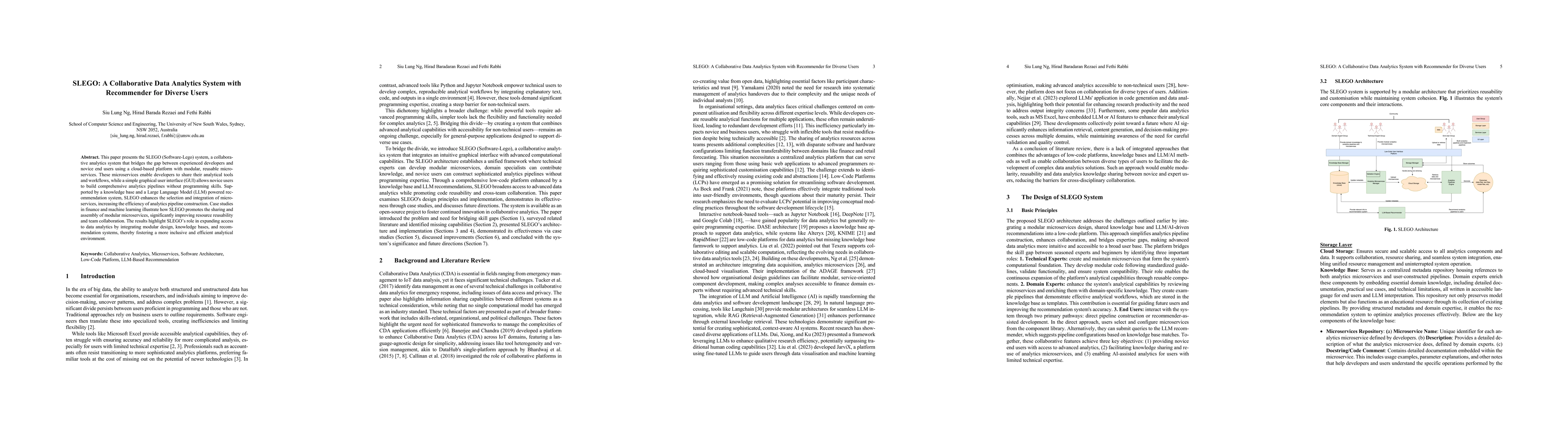 The SLEGO system is a collaborative analytics platform that enables developers and novice users to share and integrate modular microservices, facilitated by a graphical interface and an LLM-powered recommender, thereby enhancing analytics pipeline construction and democratizing data analytics. Case studies demonstrate SLEGO's effectiveness in improving resource reusability and team collaboration in finance and machine learning.