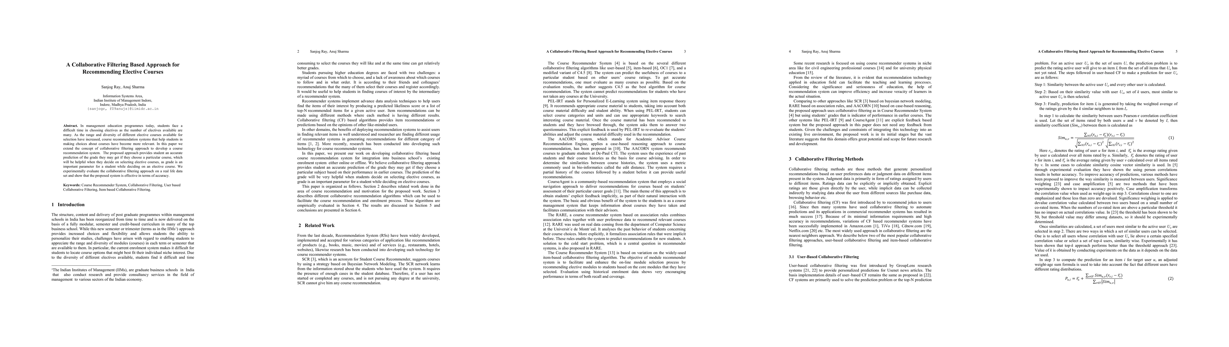 In management education programmes today, students face a difficult time in choosing electives as the number of electives available are many. As the range and diversity of different elective courses available for selection have increased, course recommendation systems that help students in making choices about courses have become more relevant. In this paper we extend the concept of collaborative filtering approach to develop a course recommendation system. The proposed approach provides student an accurate prediction of the grade they may get if they choose a particular course, which will be helpful when they decide on selecting elective courses, as grade is an important parameter for a student while deciding on an elective course. We experimentally evaluate the collaborative filtering approach on a real life data set and show that the proposed system is effective in terms of accuracy.