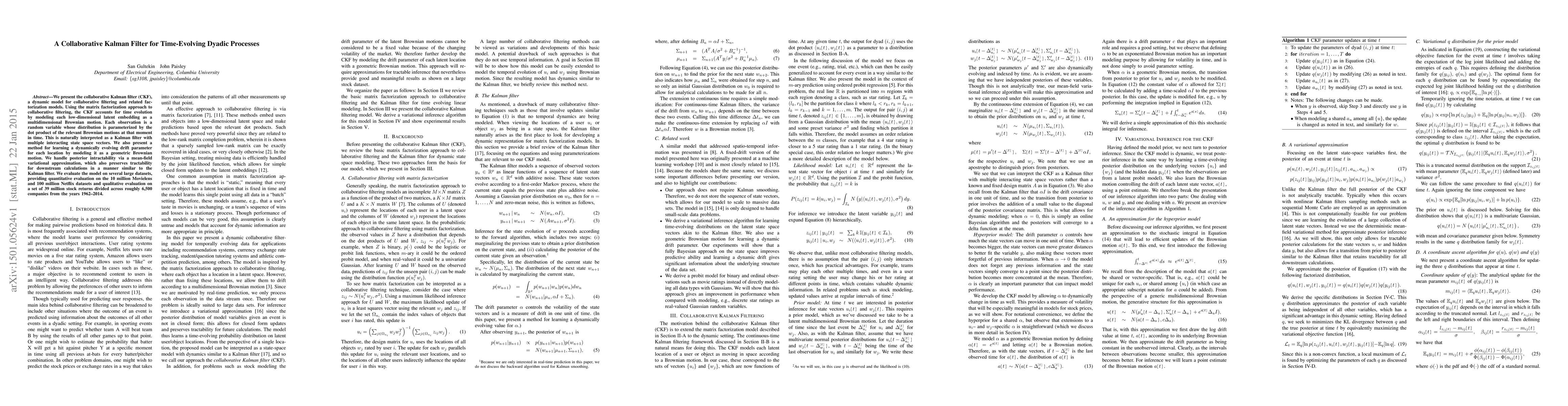 This paper introduces a collaborative Kalman filter for modeling time-evolving dyadic processes, combining matrix factorization with Brownian motion for accurate predictions on large datasets such as Movielens, Netflix, and stock returns.