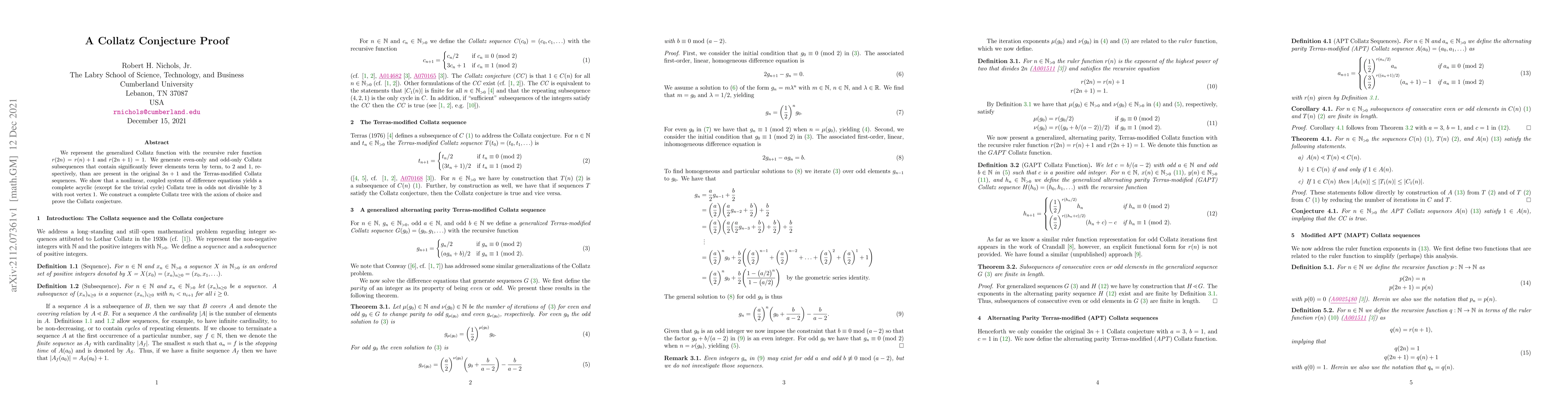 We represent the generalized Collatz function with the recursive ruler function r(2n) = r(n) + 1 and r(2n + 1) = 1. We generate even-only and odd-only Collatz subsequences that contain significantly fewer elements term by term, to 2 and 1, respectively, than are present in the original 3n + 1 and the Terras-modified Collatz sequences. We show that a nonlinear, coupled system of difference equations yields a complete acyclic (except for the trivial cycle) Collatz tree in odds not divisible by 3 with root vertex 1. We construct a complete Collatz tree with the axiom of choice and prove the Collatz conjecture.