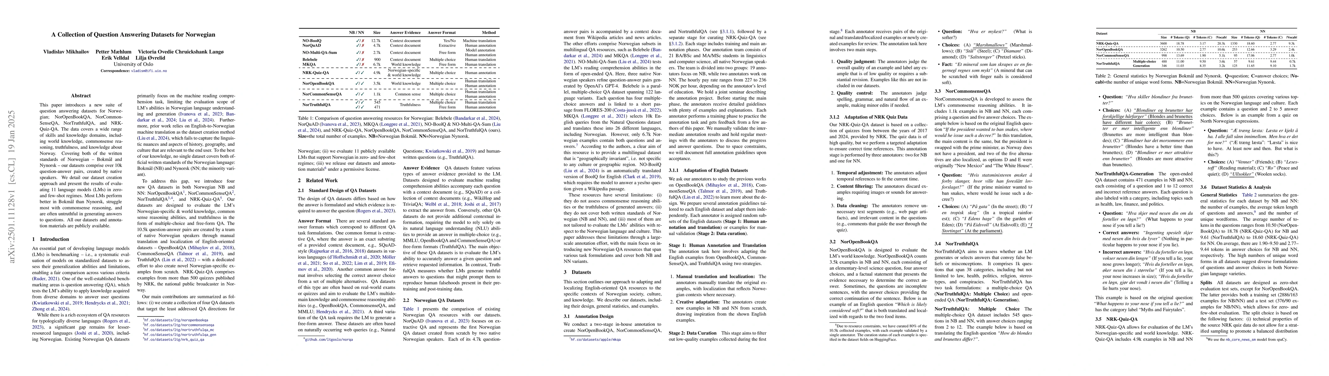 This paper presents four new Norwegian question answering datasets, evaluating 11 language models which generally perform better in Bokmål than Nynorsk and struggle with commonsense reasoning and truthfulness. All datasets are publicly available.