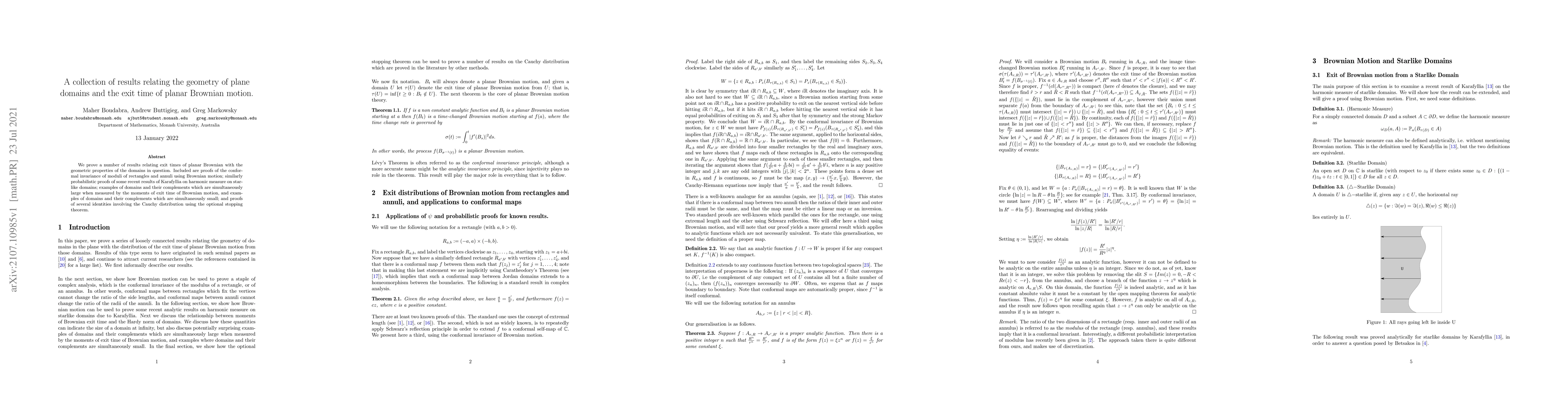 This paper establishes connections between the geometry of planar domains and the exit times of Brownian motion, proving conformal invariance of moduli of rectangles and annuli, probabilistic proofs of results on harmonic measure, and identities involving the Cauchy distribution via the optional stopping theorem. It also explores domains and their complements characterized by large and small exit time moments.