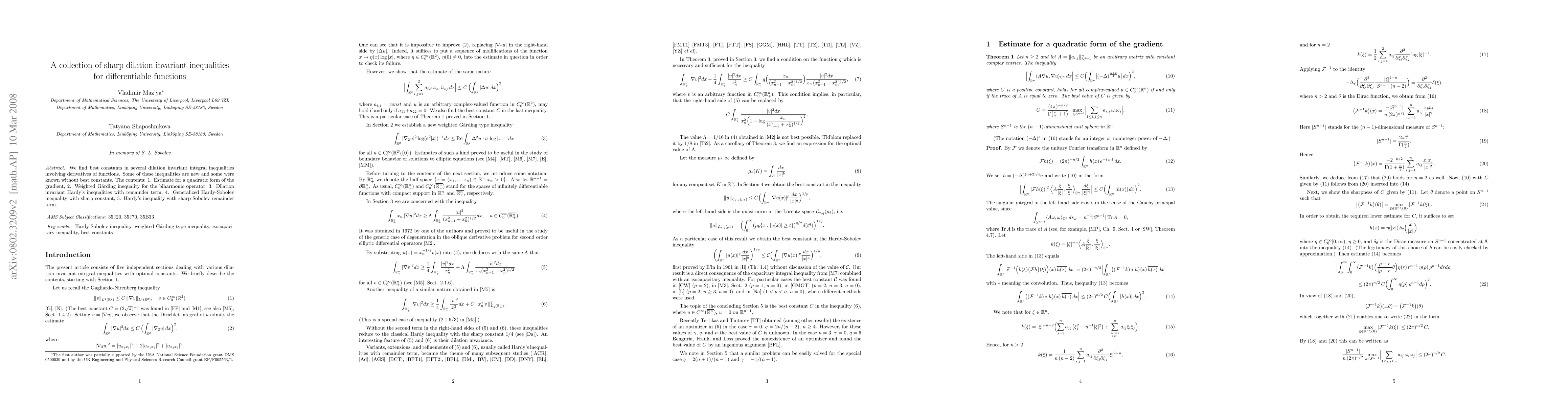 We find best constants in several dilation invariant integral inequalities involving derivatives of functions. Some of these inequalities are new and some were known without best constants. The contents: 1. Estimate for a quadratic form of the gradient, 2. Weighted G{\aa}rding inequality for the biharmonic operator, 3.Dilation invariant Hardy's inequality with remainder term, 4. Generalized Hardy-Sobolev inequality with sharp constant, 5. Hardy's inequality with sharp Sobolev remainder term.