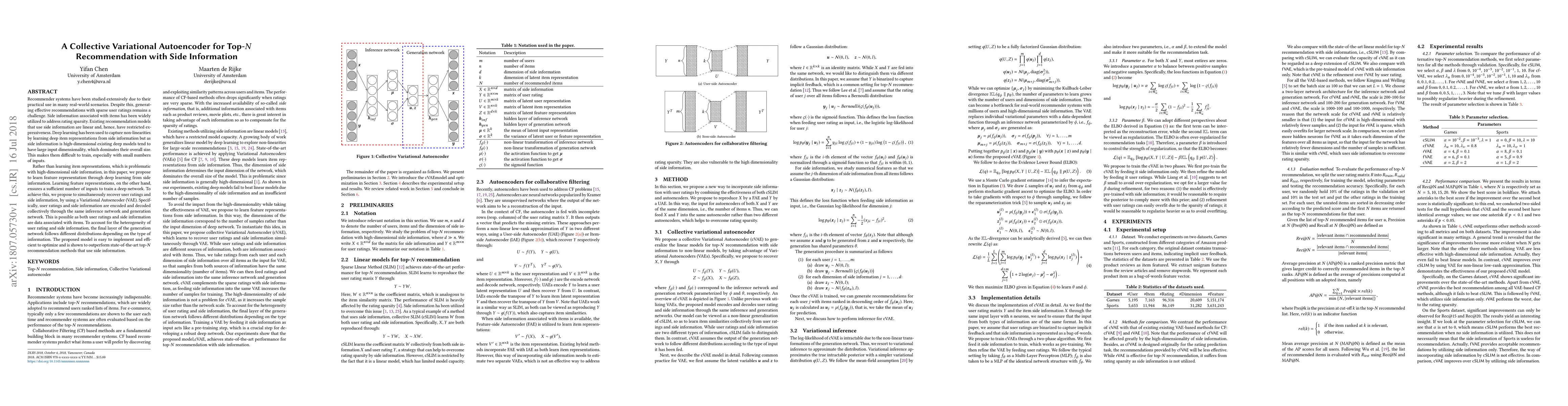 Recommender systems have been studied extensively due to their practical use in many real-world scenarios. Despite this, generating effective recommendations with sparse user ratings remains a challenge. Side information associated with items has been widely utilized to address rating sparsity. Existing recommendation models that use side information are linear and, hence, have restricted expressiveness. Deep learning has been used to capture non-linearities by learning deep item representations from side information but as side information is high-dimensional existing deep models tend to have large input dimensionality, which dominates their overall size. This makes them difficult to train, especially with small numbers of inputs. Rather than learning item representations, which is problematic with high-dimensional side information, in this paper, we propose to learn feature representation through deep learning from side information. Learning feature representations, on the other hand, ensures a sufficient number of inputs to train a deep network. To achieve this, we propose to simultaneously recover user ratings and side information, by using a Variational Autoencoder (VAE). Specifically, user ratings and side information are encoded and decoded collectively through the same inference network and generation network. This is possible as both user ratings and side information are data associated with items. To account for the heterogeneity of user rating and side information, the final layer of the generation network follows different distributions depending on the type of information. The proposed model is easy to implement and efficient to optimize and is shown to outperform state-of-the-art top-$N$ recommendation methods that use side information.